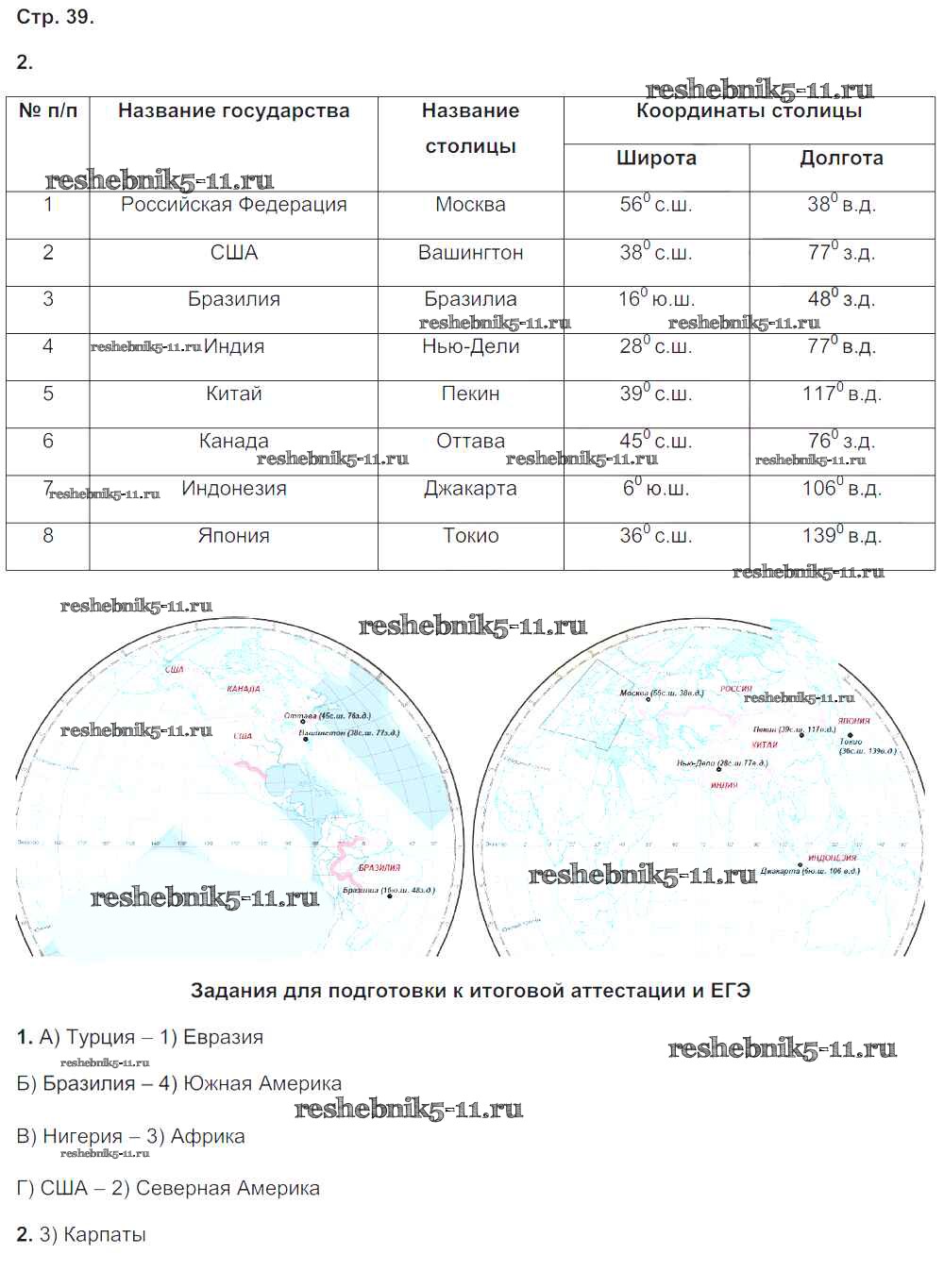 Готовая домашняя работа с ответами по Географии за 5, 6 класс Сиротин Рабочая тетрадь Дрофа 2019 ФГОС - Страницы 39