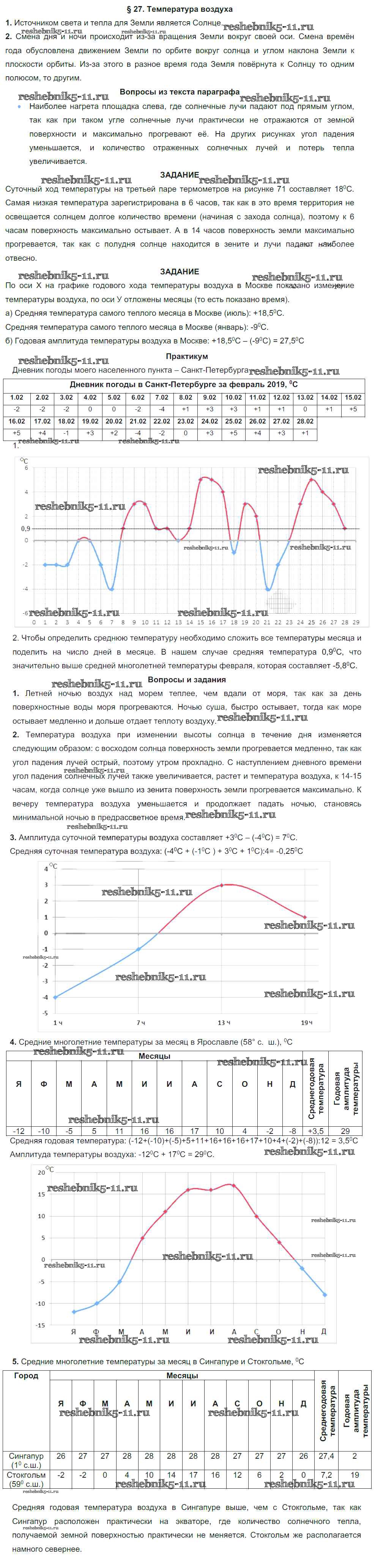 Готовая домашняя работа с ответами по Географии за 6 класс Герасимова, Неклюкова Учебник Вертикаль Дрофа 2019 ФГОС - Параграфы §27. Температура воздуха