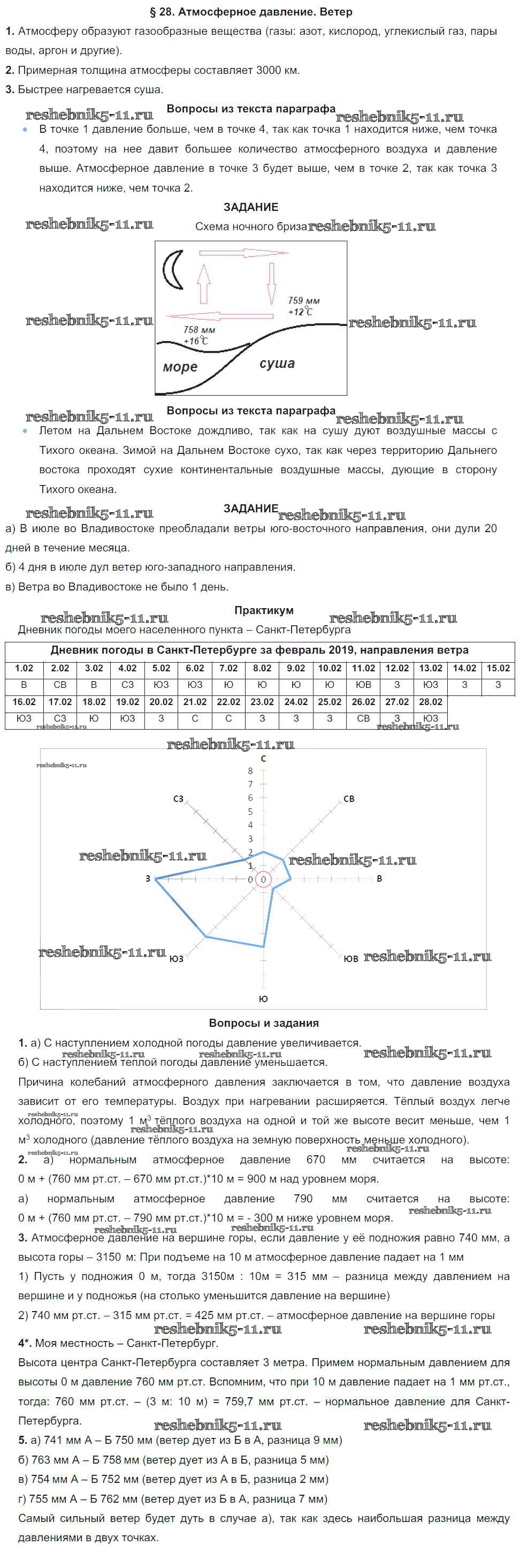 Готовая домашняя работа с ответами по Географии за 6 класс Герасимова, Неклюкова Учебник Вертикаль Дрофа 2019 ФГОС - Параграфы §28. Атмосферное давление. Ветер