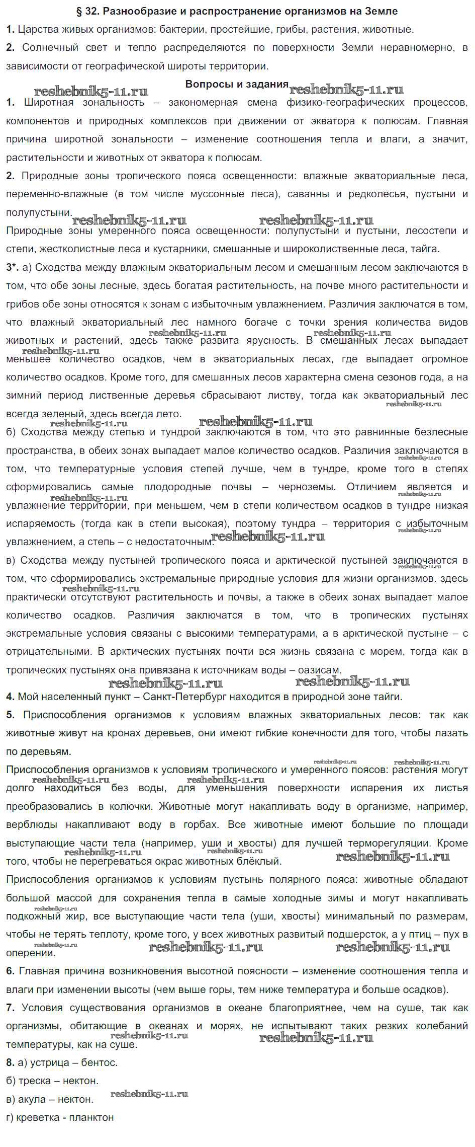 Готовая домашняя работа с ответами по Географии за 6 класс Герасимова, Неклюкова Учебник Вертикаль Дрофа 2019 ФГОС - Параграфы §32. Разнообразие и распространение организмов на Земле