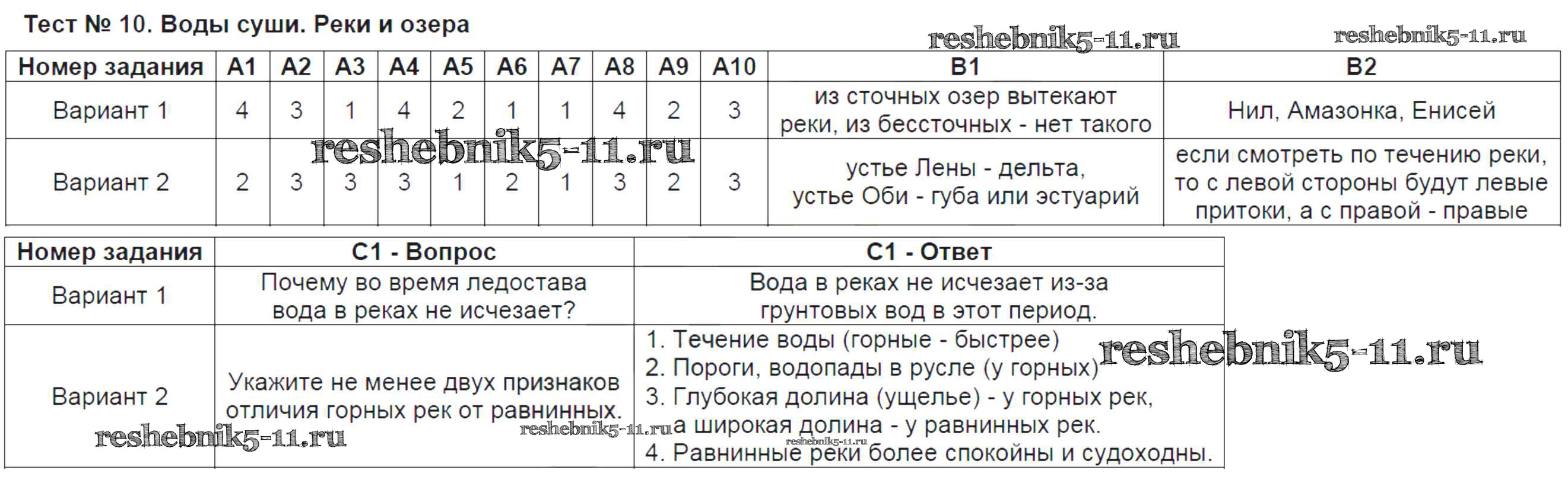 Готовая домашняя работа с ответами по Географии за 6 класс Жижина Контрольно-измерительные материалы (КИМ) ВАКО 2018 ФГОС - Тесты Тест-10. Воды суши. Реки и озера