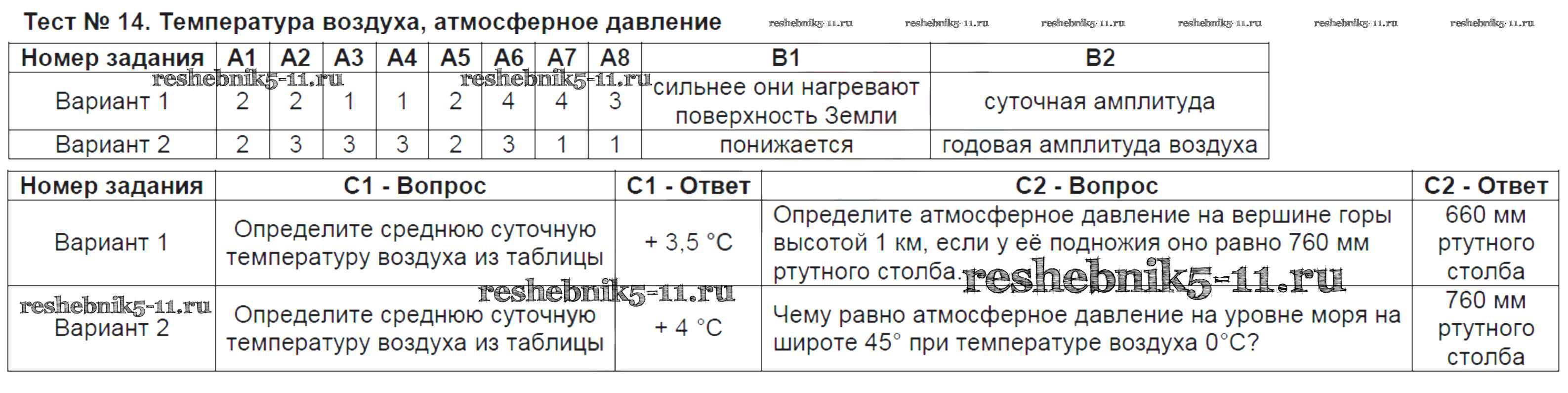 Готовая домашняя работа с ответами по Географии за 6 класс Жижина Контрольно-измерительные материалы (КИМ) ВАКО 2018 ФГОС - Тесты Тест-14. Температура воздуха, атмосферное давление