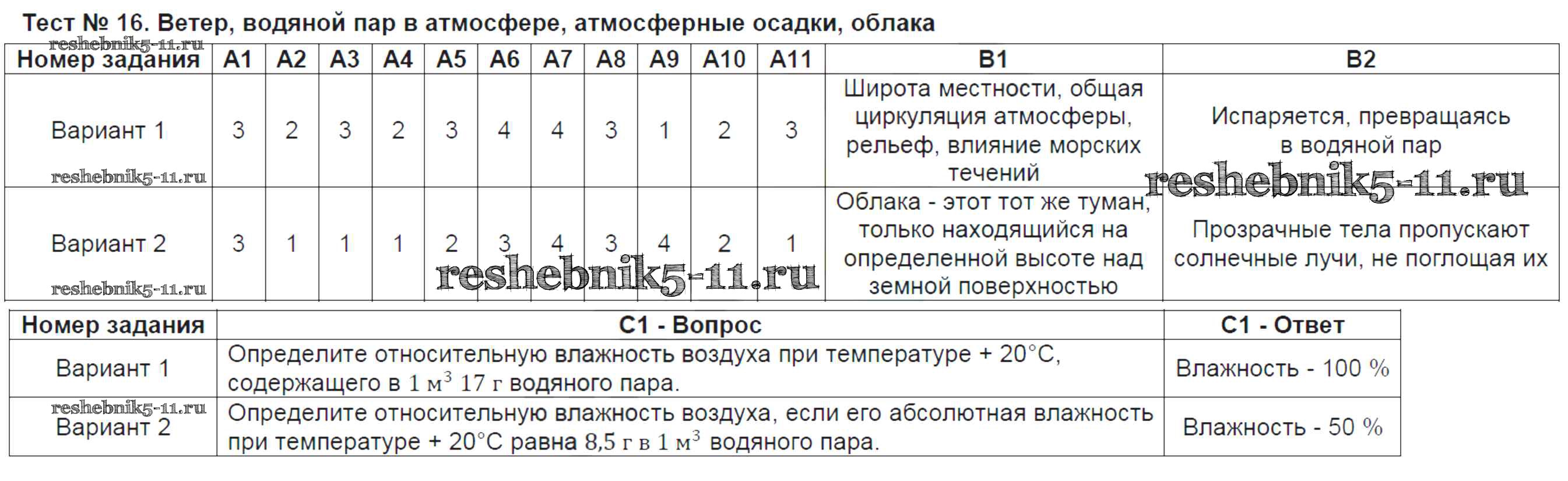 Готовая домашняя работа с ответами по Географии за 6 класс Жижина Контрольно-измерительные материалы (КИМ) ВАКО 2018 ФГОС - Тесты Тест-16. Ветер, водяной пар в атмосфере, атмосферные осадки, облака