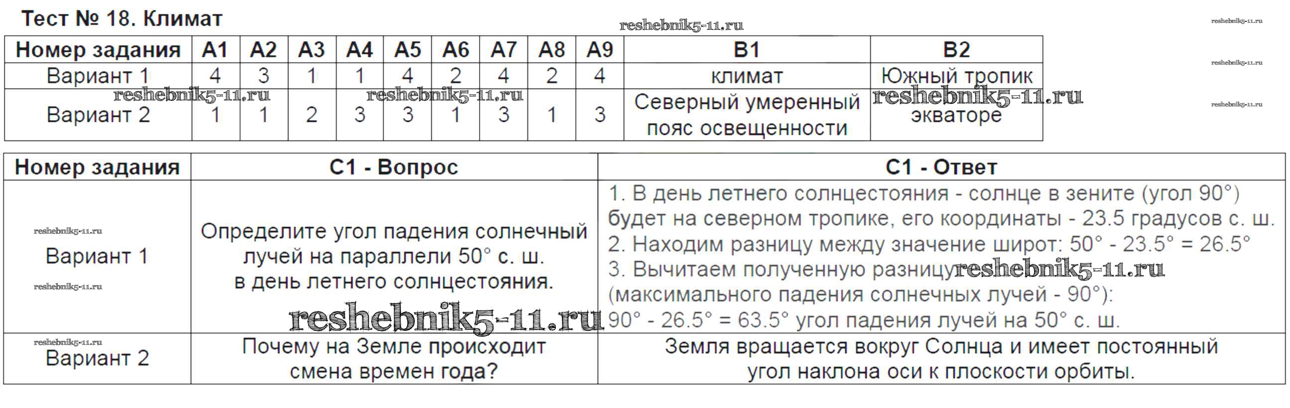 Готовая домашняя работа с ответами по Географии за 6 класс Жижина Контрольно-измерительные материалы (КИМ) ВАКО 2018 ФГОС - Тесты Тест-18. Климат