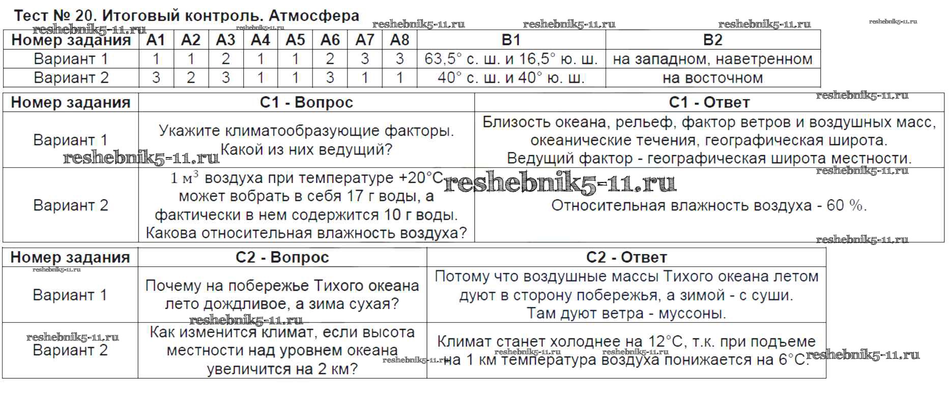 Готовая домашняя работа с ответами по Географии за 6 класс Жижина Контрольно-измерительные материалы (КИМ) ВАКО 2018 ФГОС - Тесты Тест-20. Итоговый контроль. Атмосфера