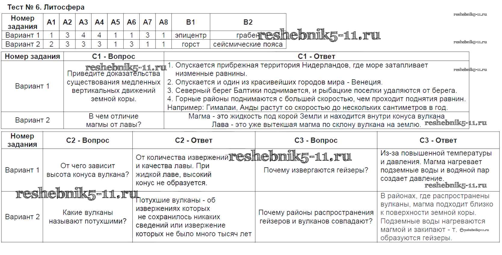 Готовая домашняя работа с ответами по Географии за 6 класс Жижина Контрольно-измерительные материалы (КИМ) ВАКО 2018 ФГОС - Тесты Тест-6. Литосфера