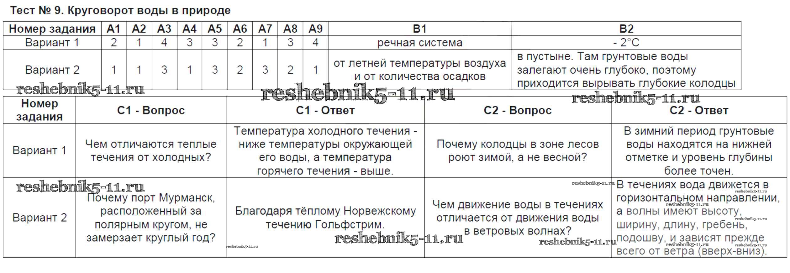 Готовая домашняя работа с ответами по Географии за 6 класс Жижина Контрольно-измерительные материалы (КИМ) ВАКО 2018 ФГОС - Тесты Тест-9. Круговорот воды в природе