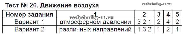 Готовая домашняя работа с ответами по Географии за 6 класс Пятунина, Пятунин Тесты УМК Экзамен 2017 ФГОС - Тесты Тест-26. Движение воздуха