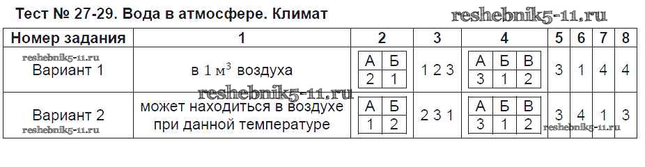 Готовая домашняя работа с ответами по Географии за 6 класс Пятунина, Пятунин Тесты УМК Экзамен 2017 ФГОС - Тесты Тест-27-29. Вода в атмосфере. Климат