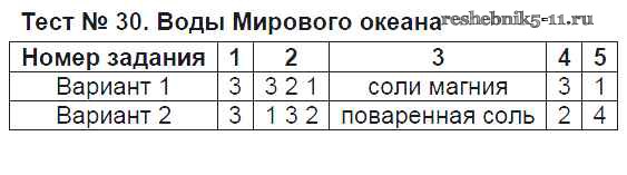 Готовая домашняя работа с ответами по Географии за 6 класс Пятунина, Пятунин Тесты УМК Экзамен 2017 ФГОС - Тесты Тест-30. Воды Мирового океана