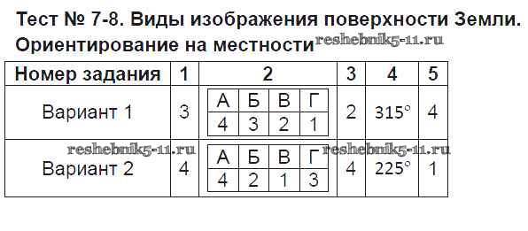 Готовая домашняя работа с ответами по Географии за 6 класс Пятунина, Пятунин Тесты УМК Экзамен 2017 ФГОС - Тесты Тест-7-8. Виды изображения поверхности Земли