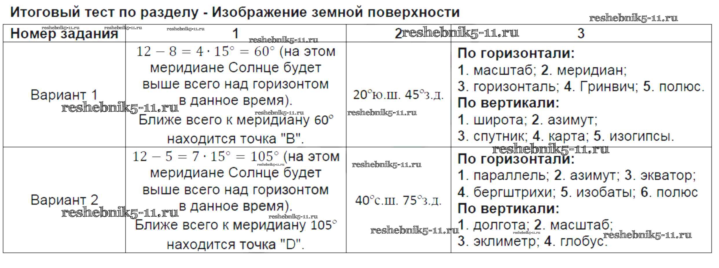 Готовая домашняя работа с ответами по Географии за 6 класс Пятунина, Пятунин Тесты УМК Экзамен 2017 ФГОС - Итоговые тесты Итоговый тест по разделу - Изображение земной поверхности