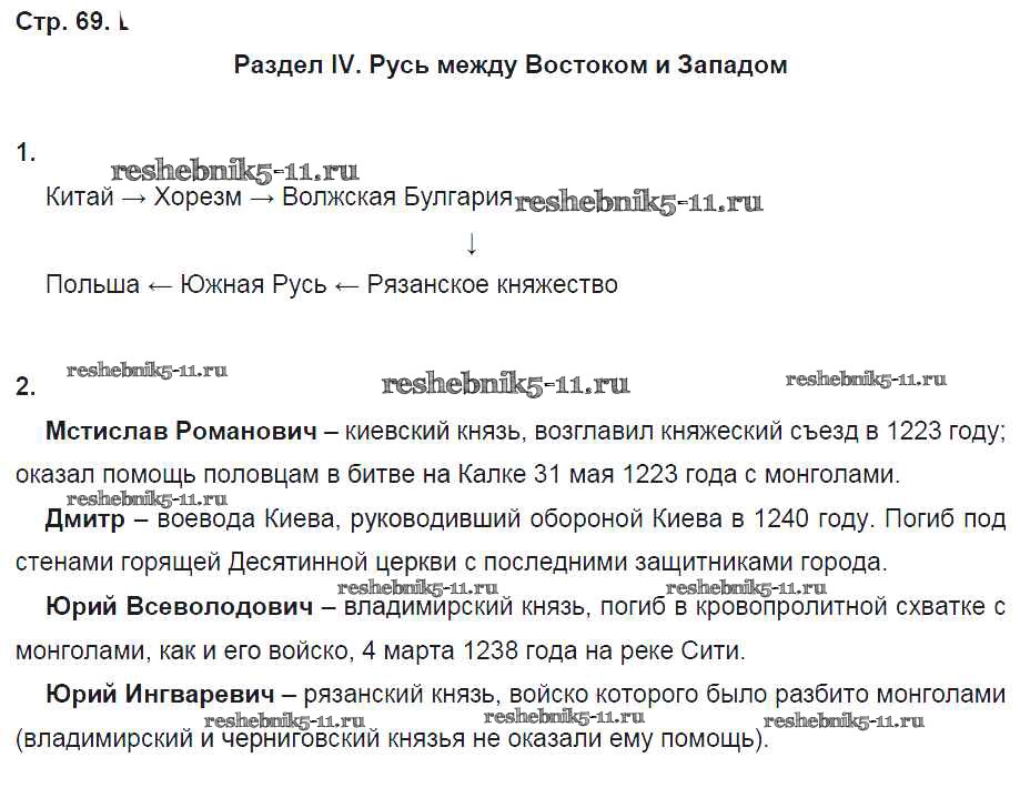 Готовая домашняя работа с ответами по Истории за 6 класс Кочегаров Рабочая тетрадь Инновационная школа Русское слово 2017 ФГОС - Раздел 4. Русь между Востоком и Западом стр. 69