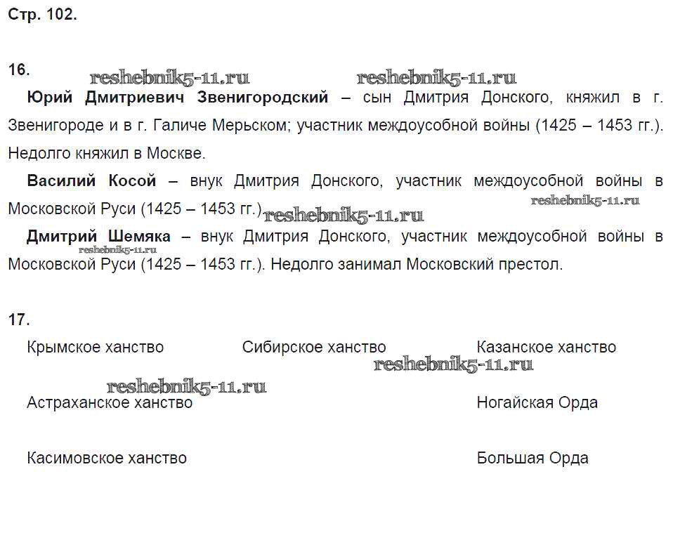 Готовая домашняя работа с ответами по Истории за 6 класс Кочегаров Рабочая тетрадь Инновационная школа Русское слово 2017 ФГОС - Раздел 5. Русские земли в середине XIII-XV веке стр. 102