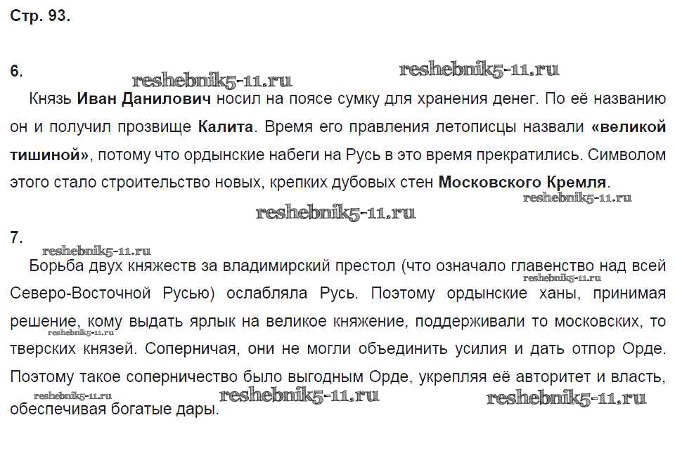 Готовая домашняя работа с ответами по Истории за 6 класс Кочегаров Рабочая тетрадь Инновационная школа Русское слово 2017 ФГОС - Раздел 5. Русские земли в середине XIII-XV веке стр. 93