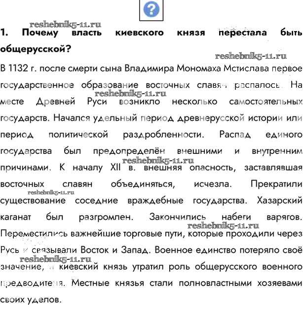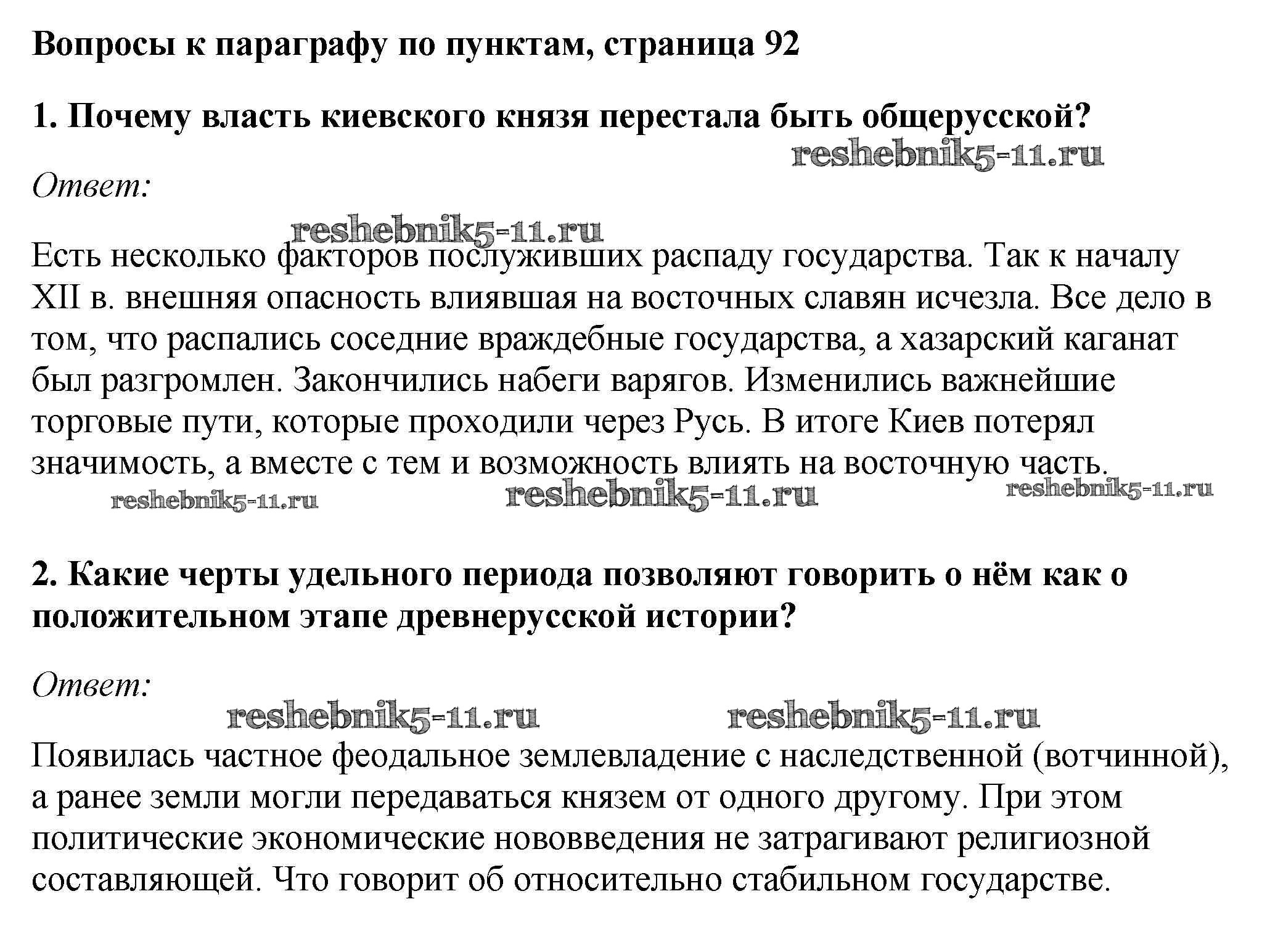 Готовая домашняя работа с ответами по Истории за 6 класс Андреев, Федоров Учебник Вертикаль Дрофа 2016 - §13. Начало удельного периода Княжества Южной Руси стр.92