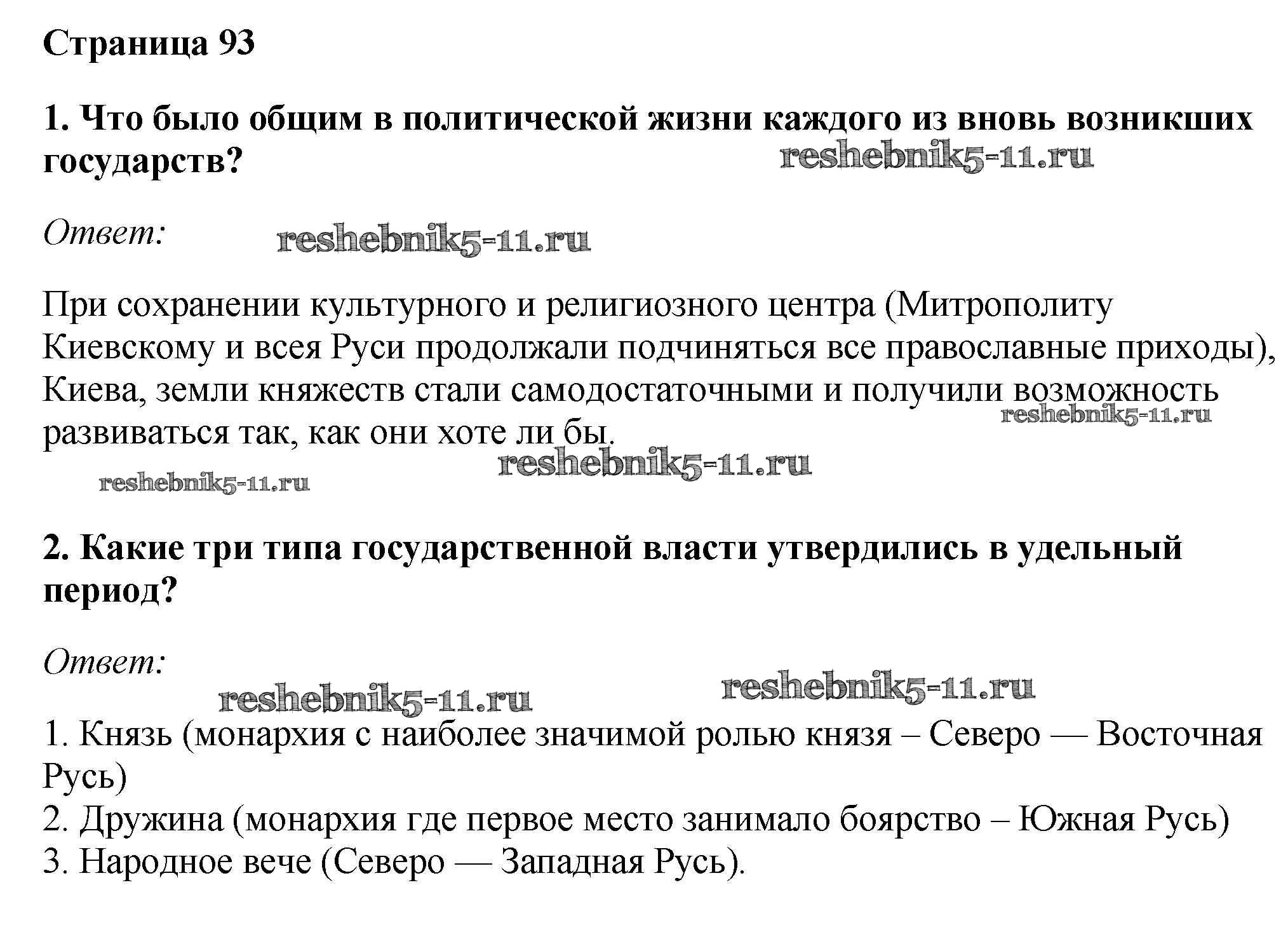 Готовая домашняя работа с ответами по Истории за 6 класс Андреев, Федоров Учебник Вертикаль Дрофа 2016 - §13. Начало удельного периода Княжества Южной Руси стр.93
