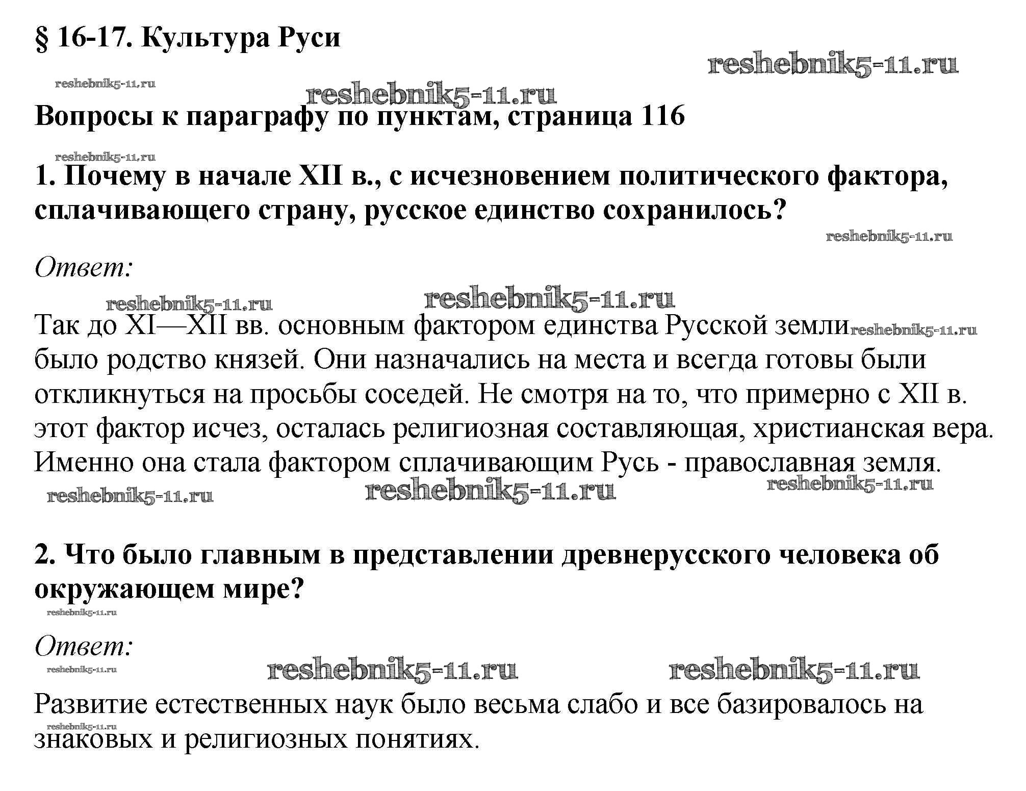 Готовая домашняя работа с ответами по Истории за 6 класс Андреев, Федоров Учебник Вертикаль Дрофа 2016 - §16-17. Культура Руси стр.116
