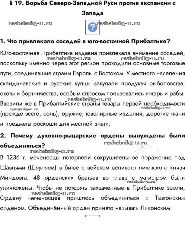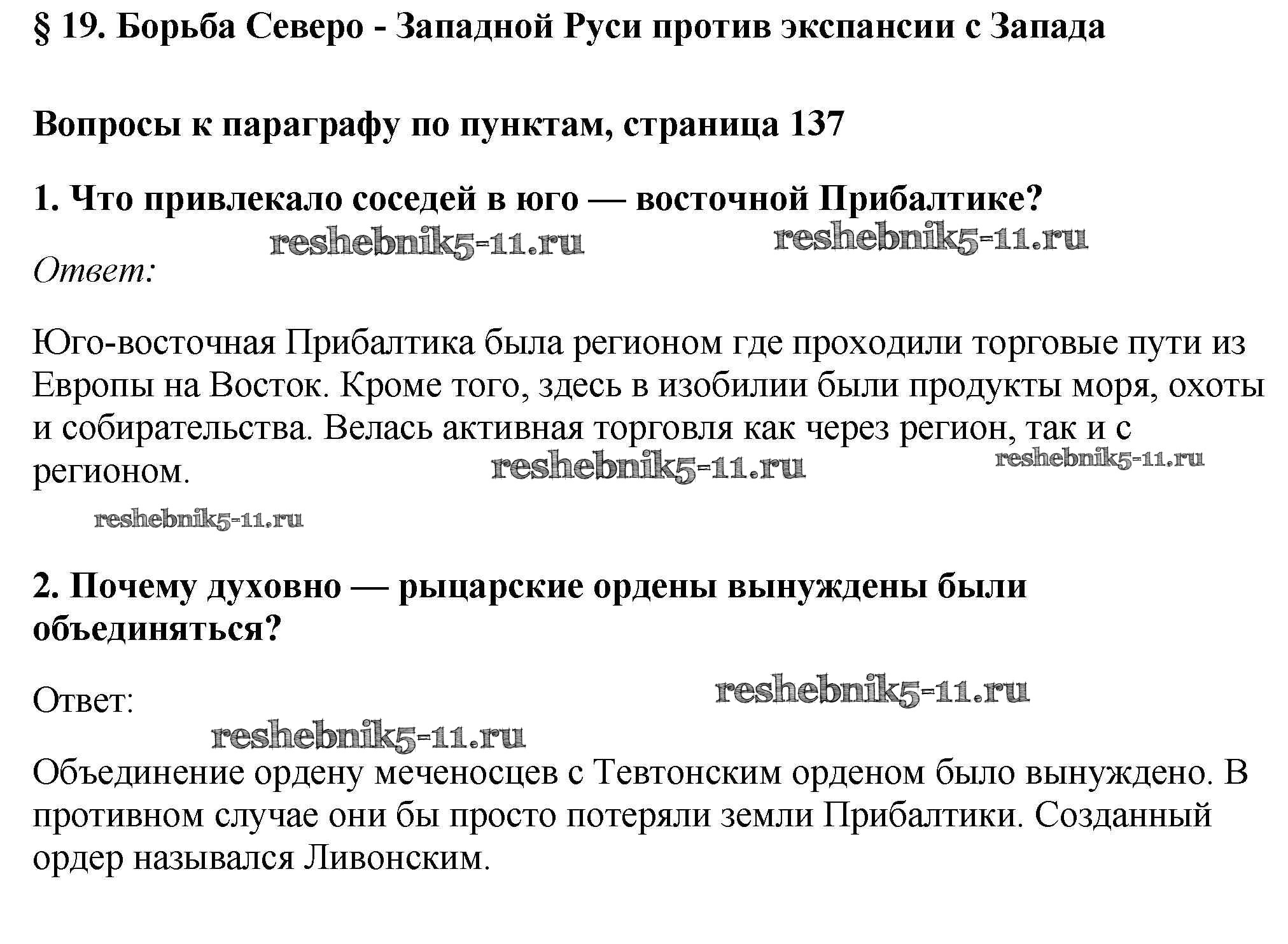 Готовая домашняя работа с ответами по Истории за 6 класс Андреев, Федоров Учебник Вертикаль Дрофа 2016 - §19. Борьба Северо - Западной Руси против экспансии с Запада стр.137