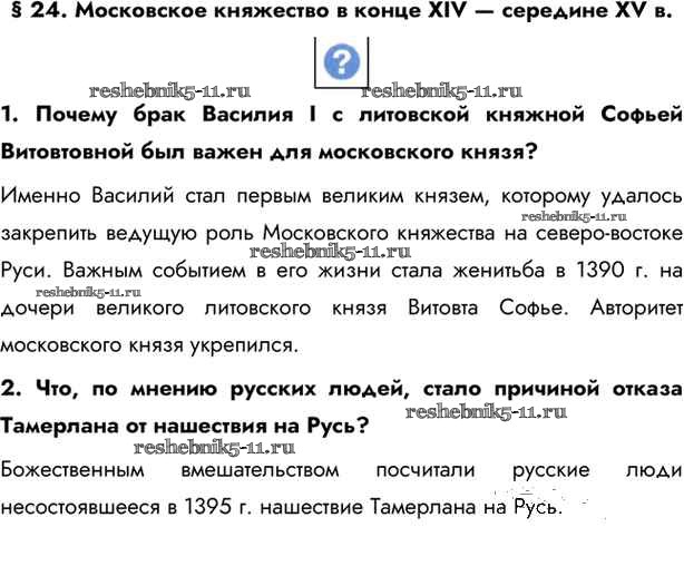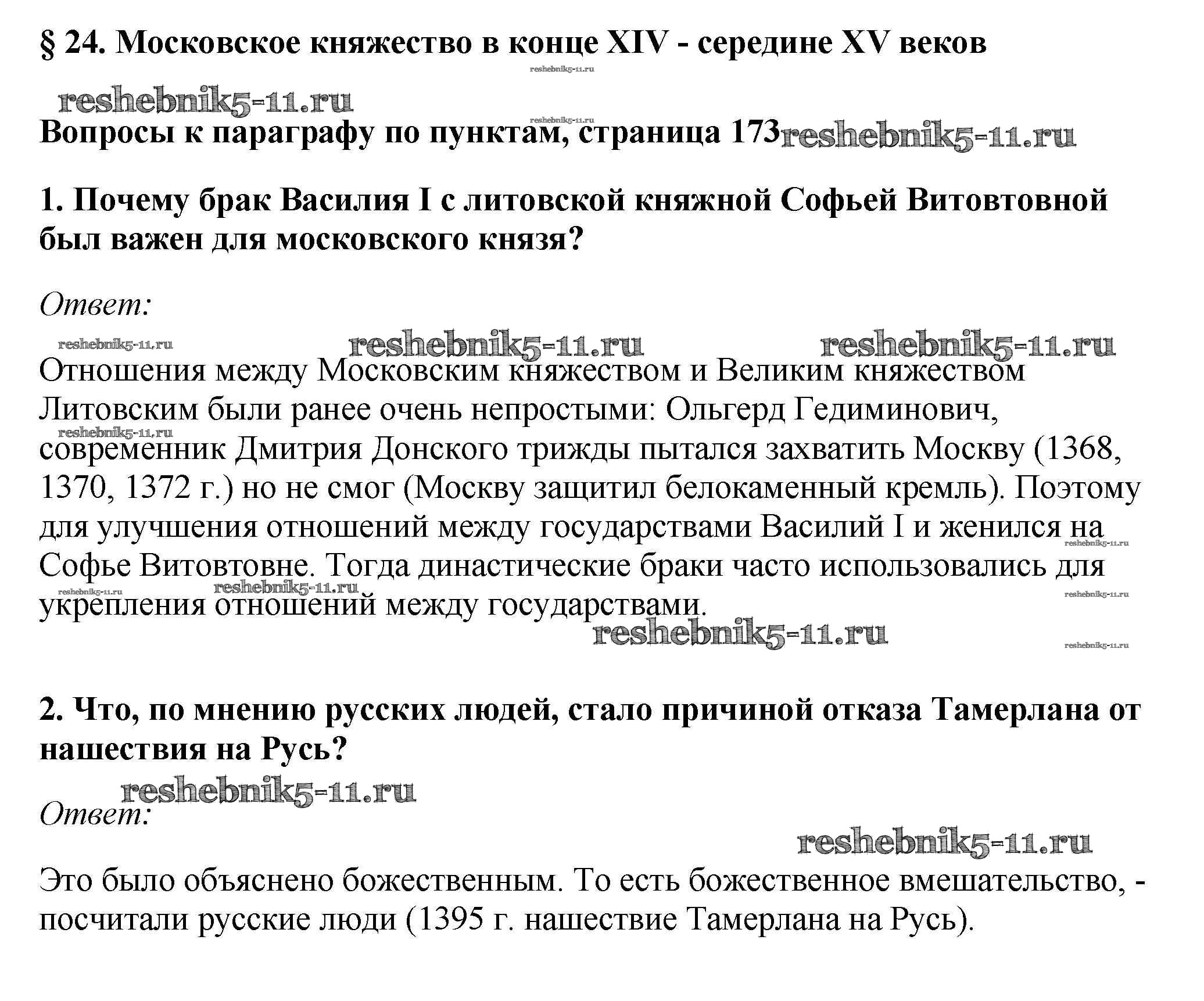 Готовая домашняя работа с ответами по Истории за 6 класс Андреев, Федоров Учебник Вертикаль Дрофа 2016 - §24. Московское княжество в конце XIV - середине XV веков стр.173