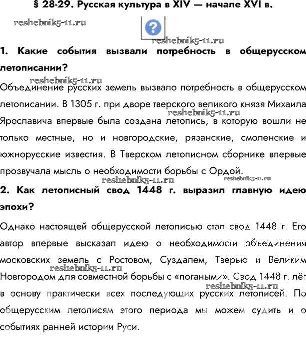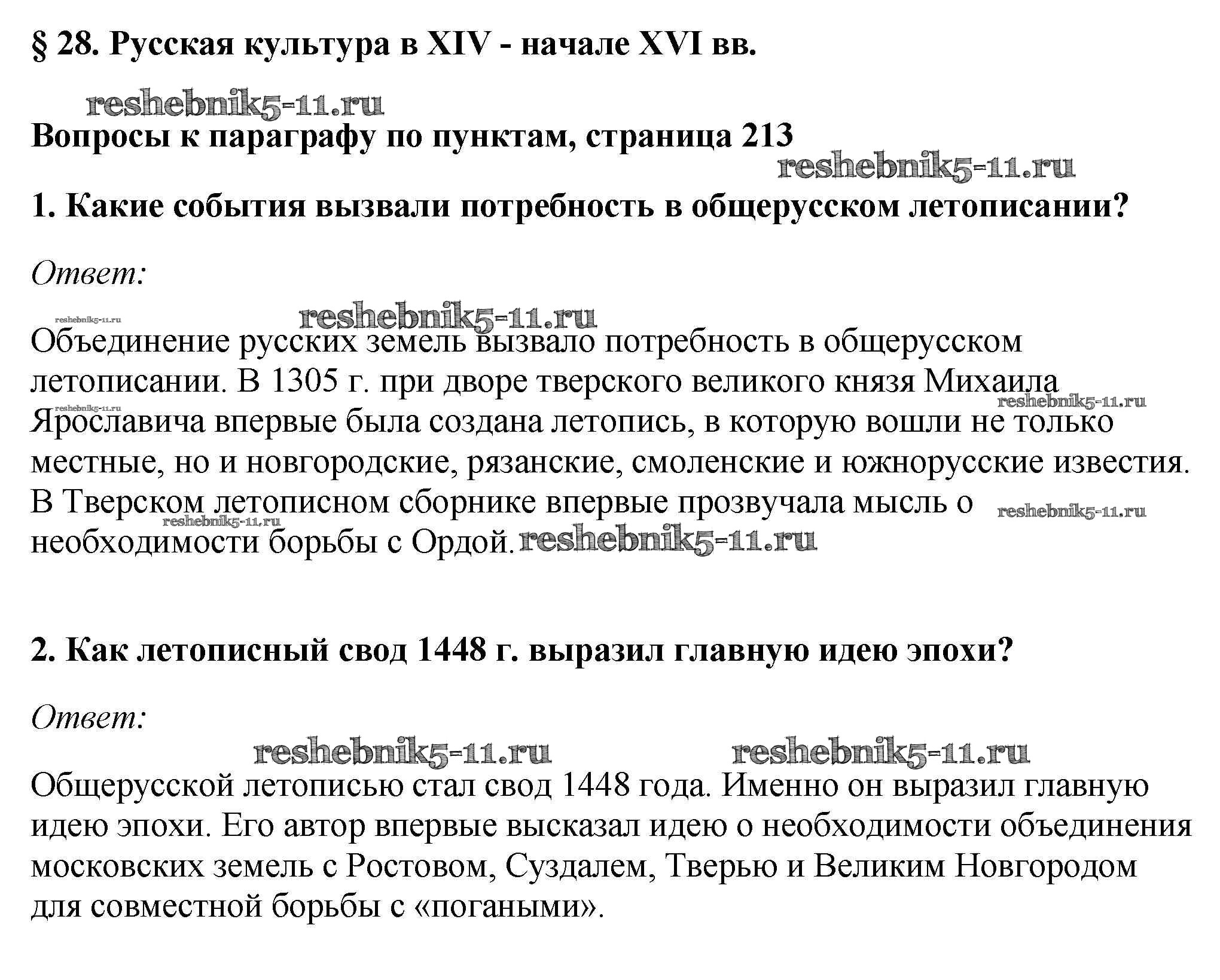 Готовая домашняя работа с ответами по Истории за 6 класс Андреев, Федоров Учебник Вертикаль Дрофа 2016 - §28-29. Русская культура в XIV - начале XVI вв. стр.213