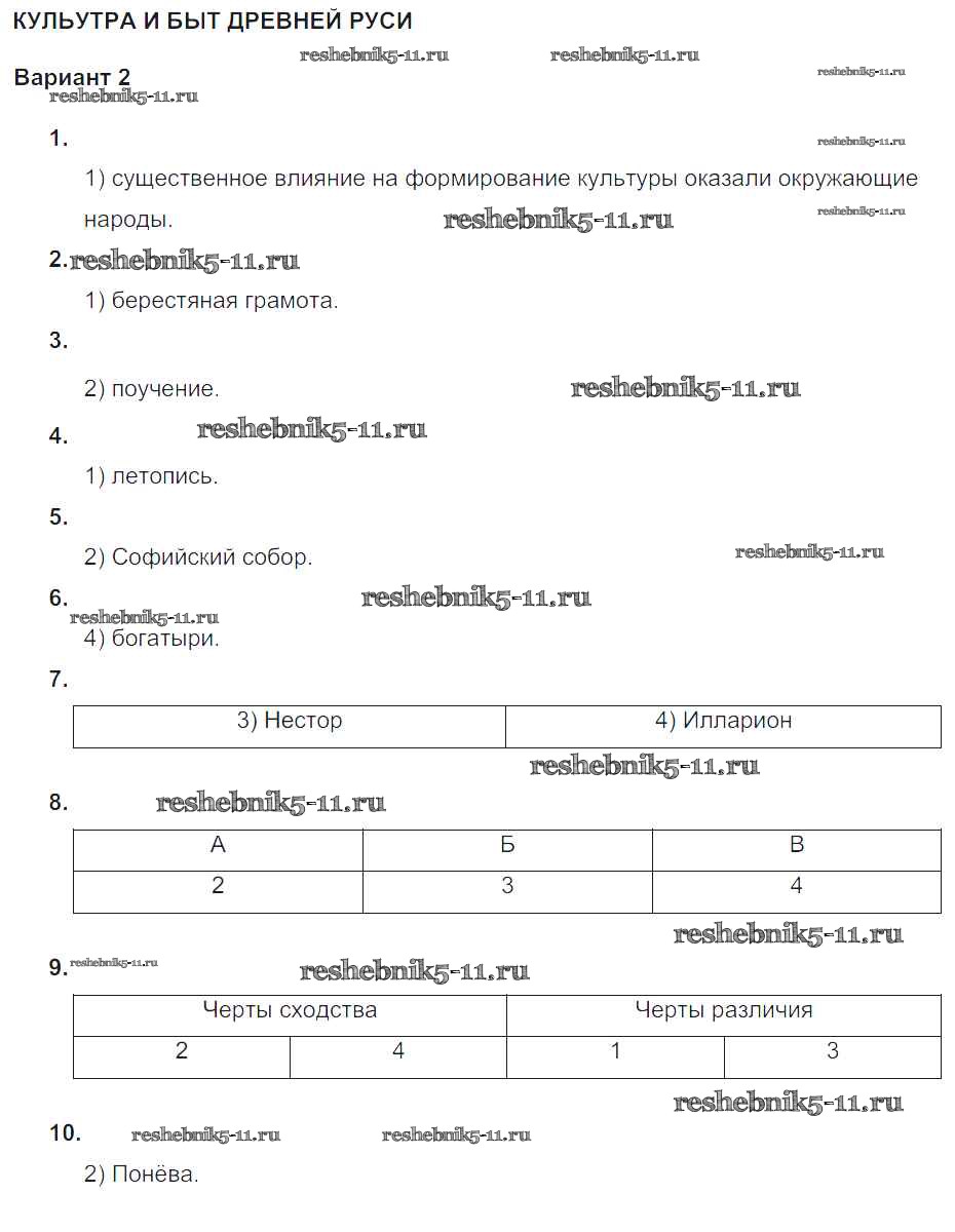 Готовая домашняя работа с ответами по Истории за 6 класс Артасов, Гаврилина Тематический контроль Национальное образование 2015 ФГОС - СР-№3. Культура и быт Древней Руси Вариант-2