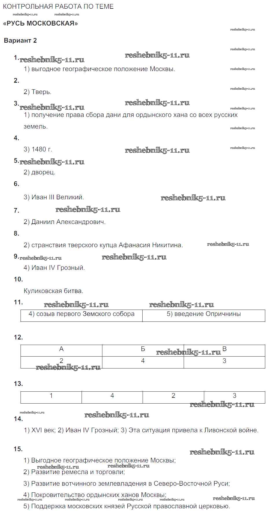 Готовая домашняя работа с ответами по Истории за 6 класс Артасов, Гаврилина Тематический контроль Национальное образование 2015 ФГОС - КР. Русь Московская Вариант-2