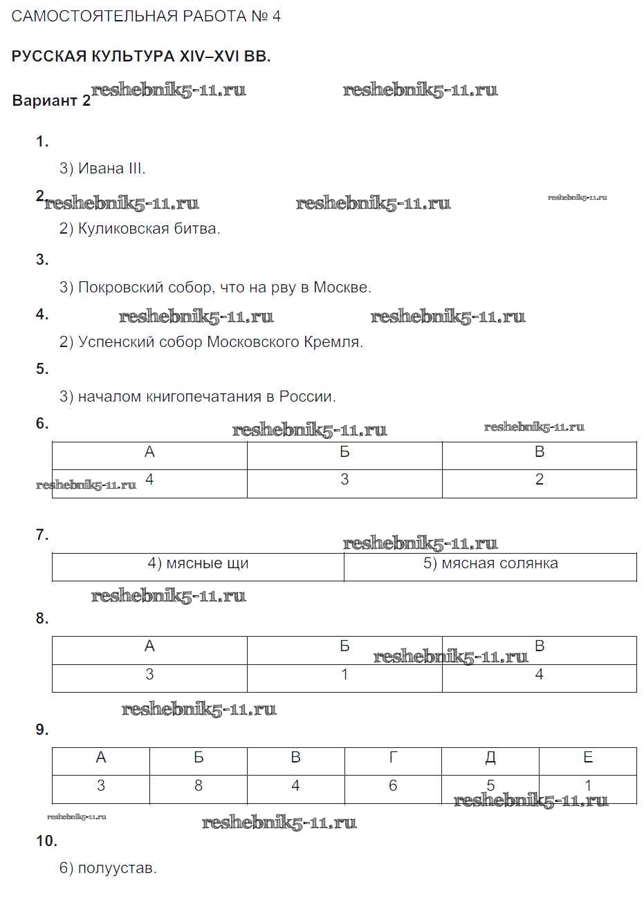 Готовая домашняя работа с ответами по Истории за 6 класс Артасов, Гаврилина Тематический контроль Национальное образование 2015 ФГОС - СР-№4. Русская культура в XIV-XVI вв. Вариант-2