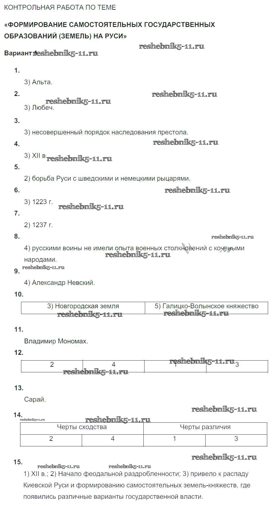 Готовая домашняя работа с ответами по Истории за 6 класс Артасов, Гаврилина Тематический контроль Национальное образование 2015 ФГОС - КР. Формирование самостоятельных земель на Руси Вариант-1