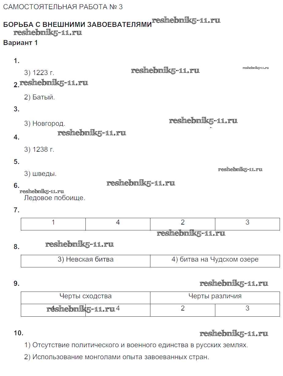 Готовая домашняя работа с ответами по Истории за 6 класс Артасов, Гаврилина Тематический контроль Национальное образование 2015 ФГОС - СР-№3. Борьба с внешними завоевателями Вариант-1