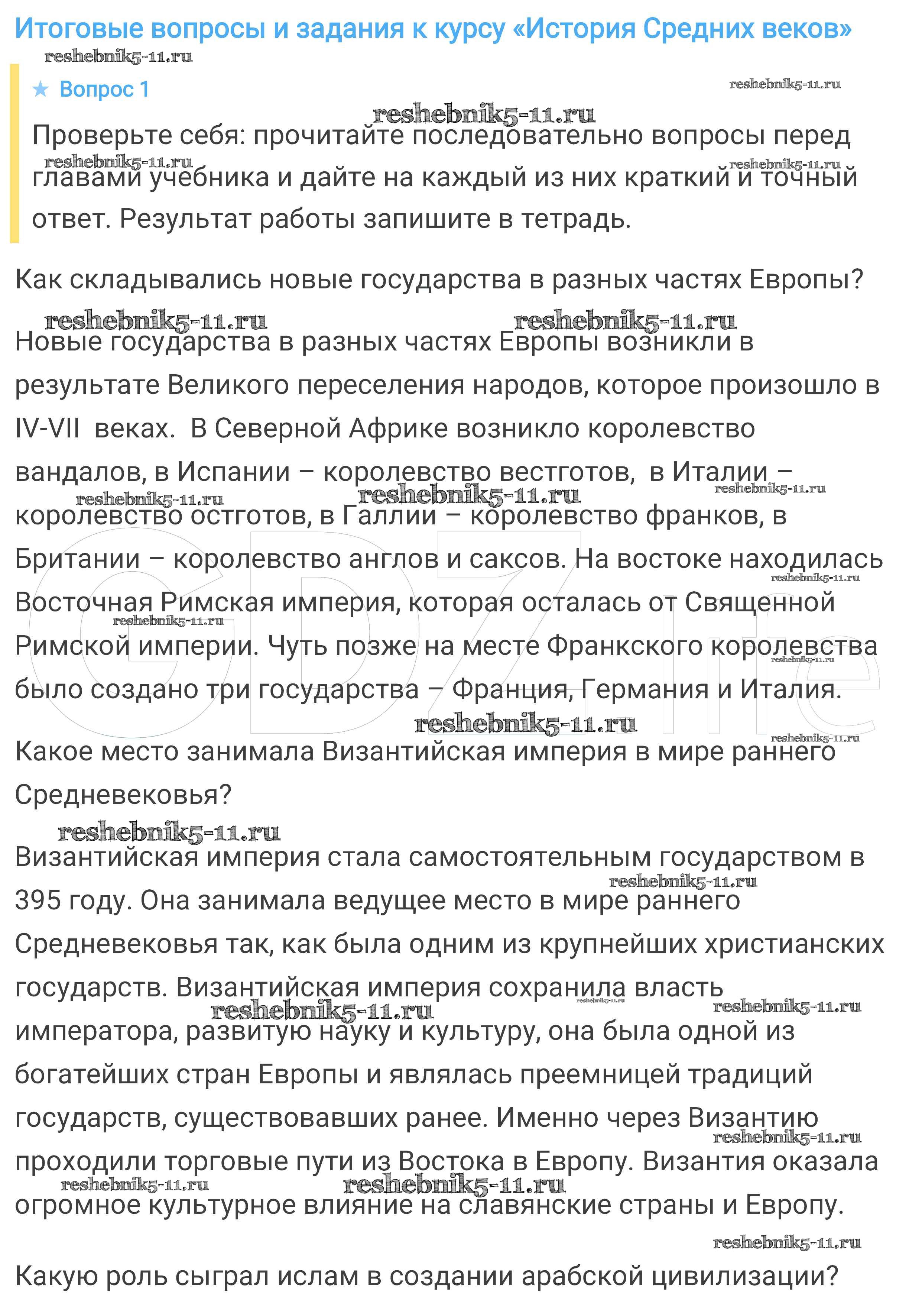 Готовая домашняя работа с ответами по Истории за 6 класс Агибалова, Донской Учебник Просвещение 2014 ФГОС - Итоговые вопросы и заданиям к курсу "История Средних веков" 1