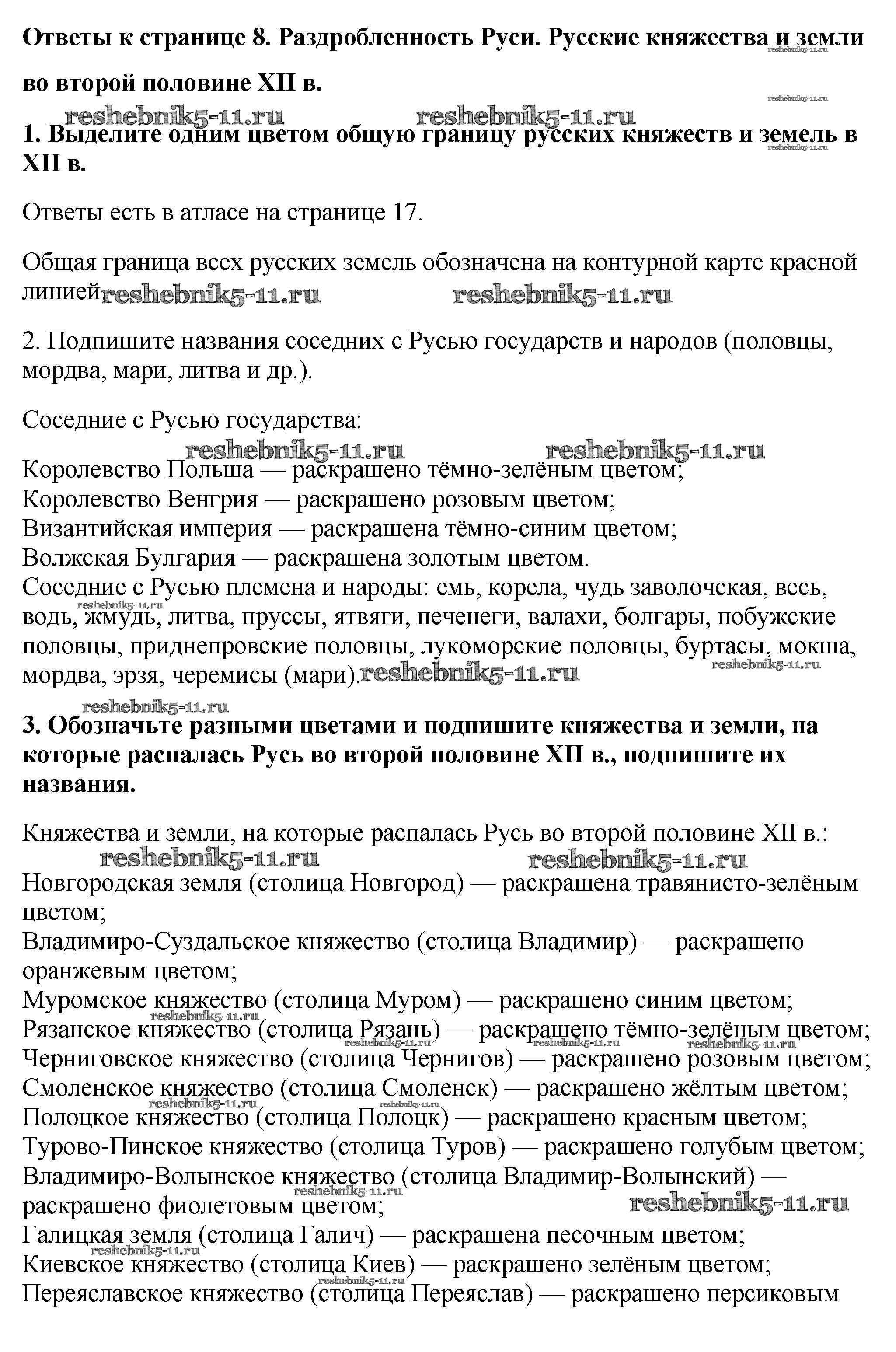 Готовая домашняя работа с ответами по Истории за 6 класс Тороп Контурные карты УМК Дрофа 2019 ФГОС - Страницы Страница 8. Раздробленность Руси. Русские княжества и земли во второй половине 12 в.