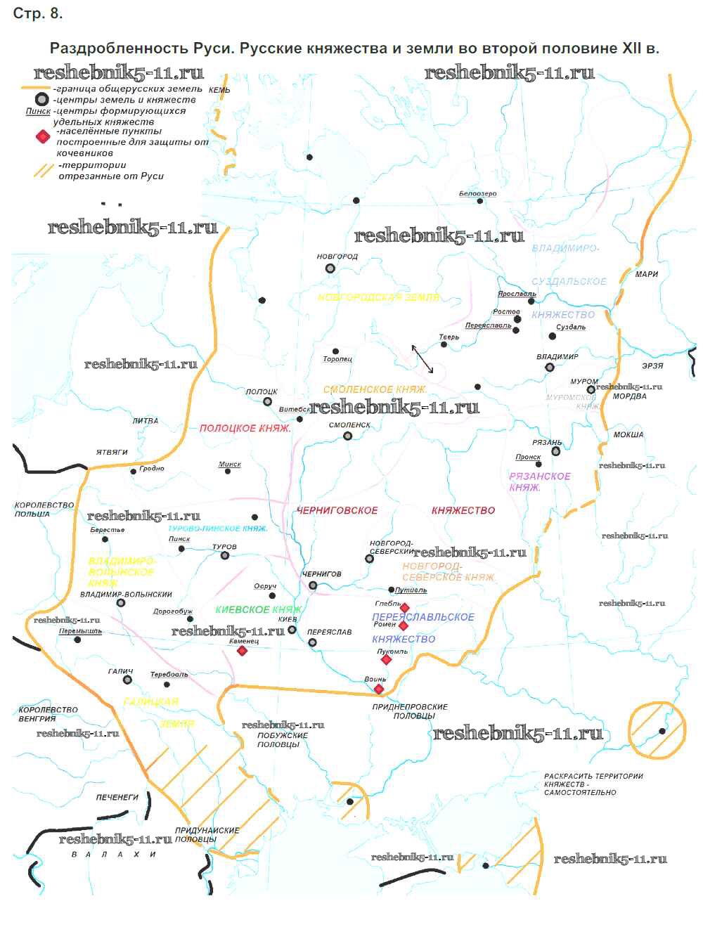 История за 6 класс Тороп Контурные карты УМК Дрофа страница Страница 8. Раздробленность Руси. Русские княжества и земли во второй половине 12 в.