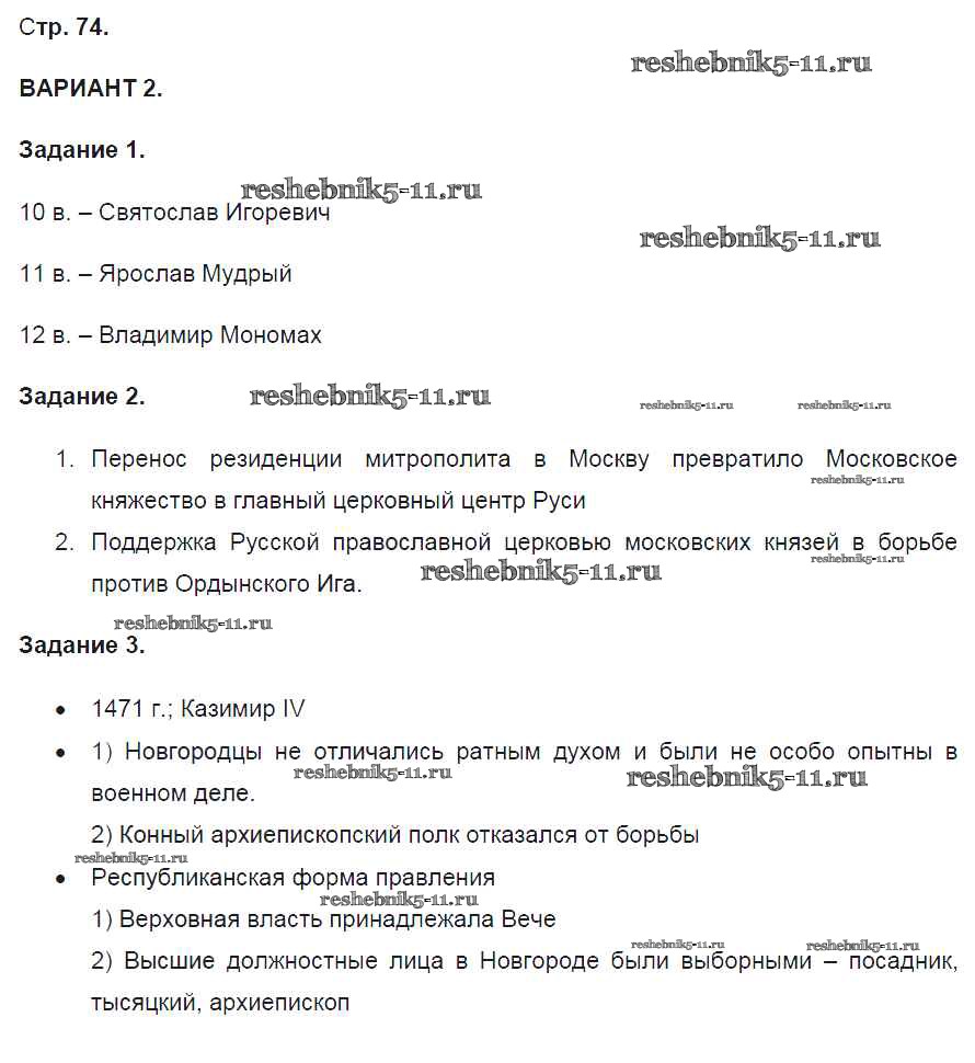 Готовая домашняя работа с ответами по Истории за 6 класс Артасов Контрольные работы УМК Просвещение 2016 ФГОС - Страницы 74