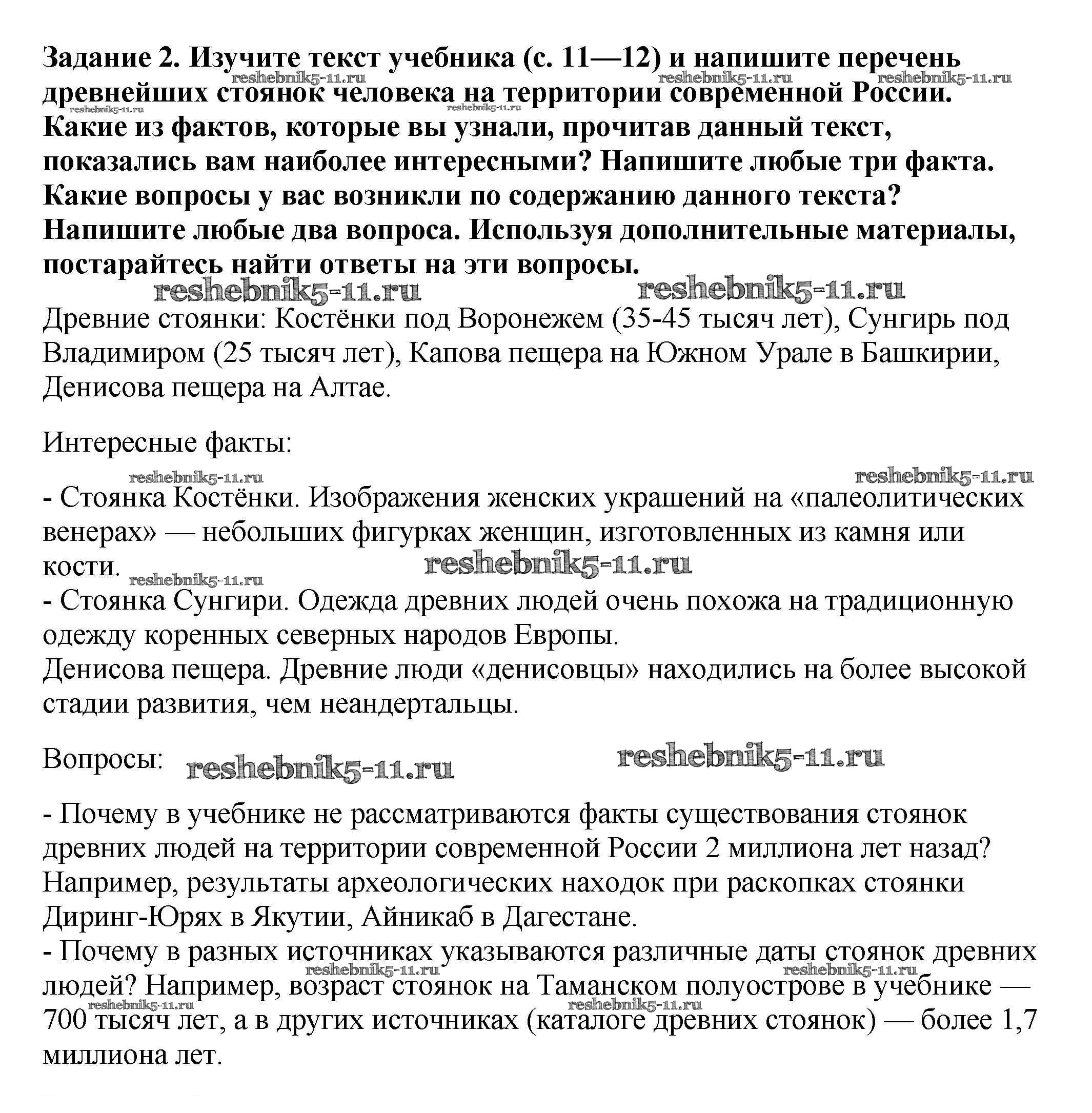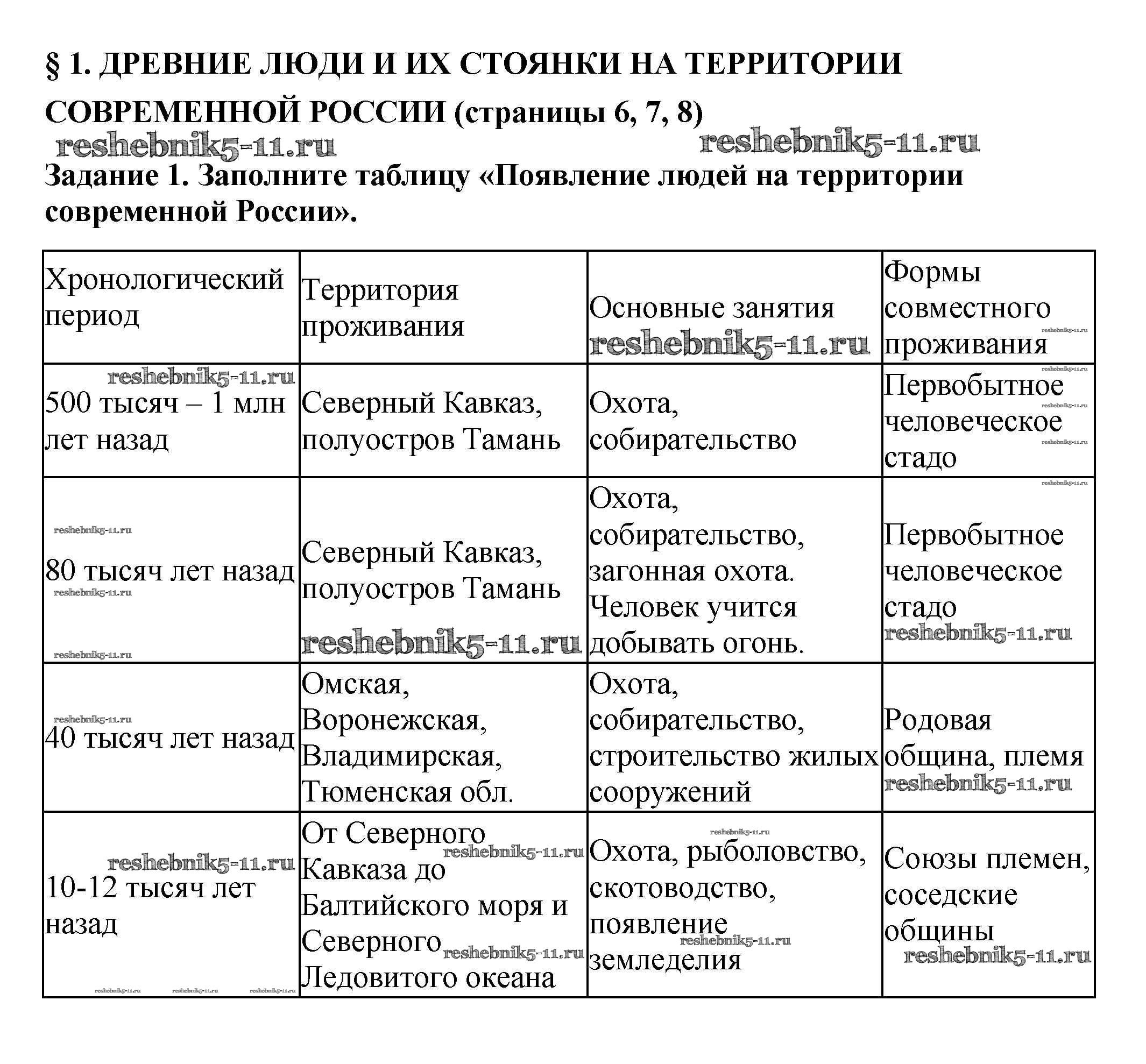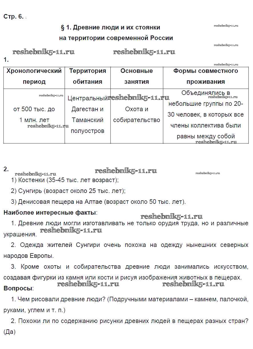 Готовая домашняя работа с ответами по Истории за 6 класс Артасов, Данилов, Косулина, Соколова Рабочая тетрадь Просвещение 2016 ФГОС - §1. Древние люди и их стоянки на территории современной России стр. 6
