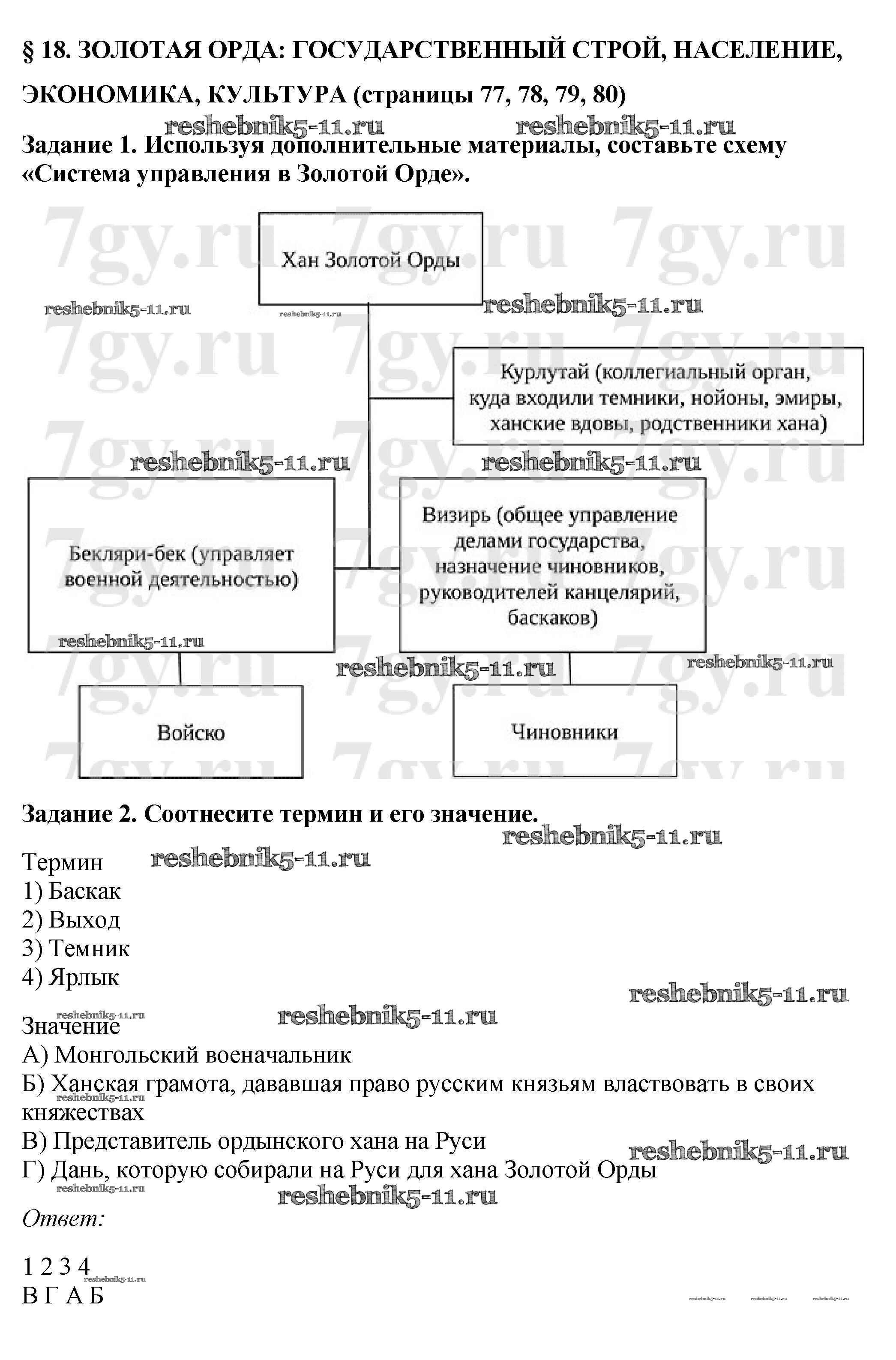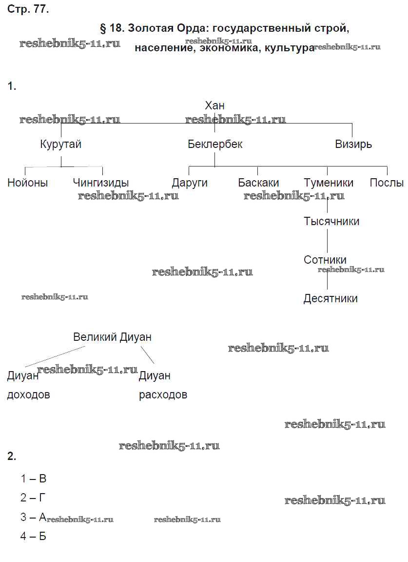 Готовая домашняя работа с ответами по Истории за 6 класс Артасов, Данилов, Косулина, Соколова Рабочая тетрадь Просвещение 2016 ФГОС - §18. Золотая Орда: Государственный строй. Население. Экономика. Культура стр. 77