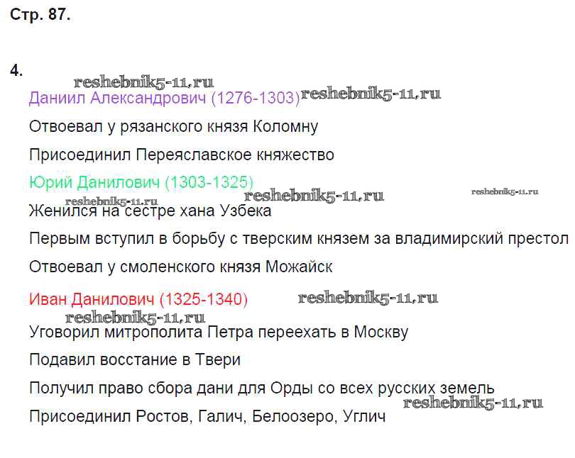 Готовая домашняя работа с ответами по Истории за 6 класс Артасов, Данилов, Косулина, Соколова Рабочая тетрадь Просвещение 2016 ФГОС - §20. Усиление Московского княжества стр. 87