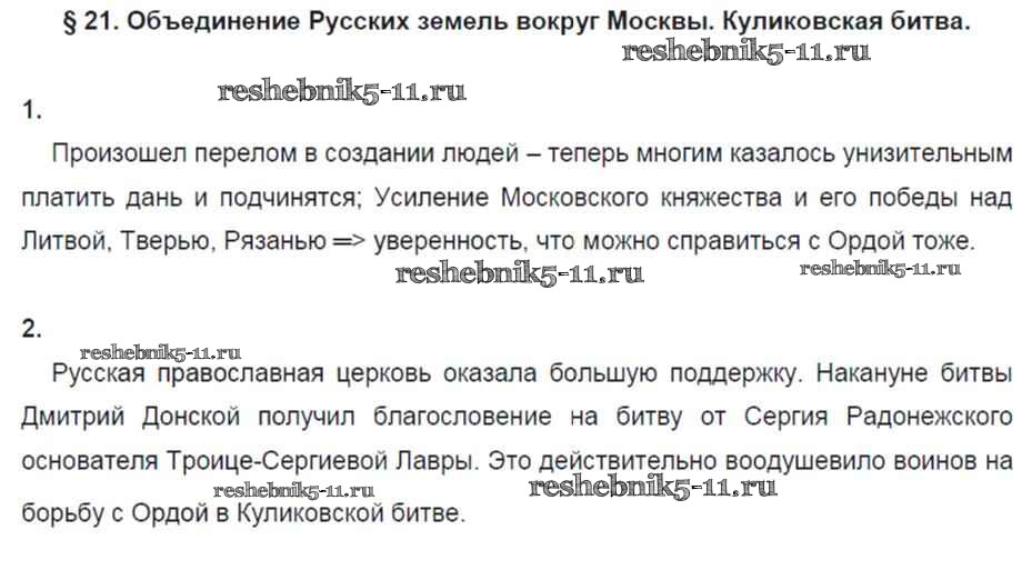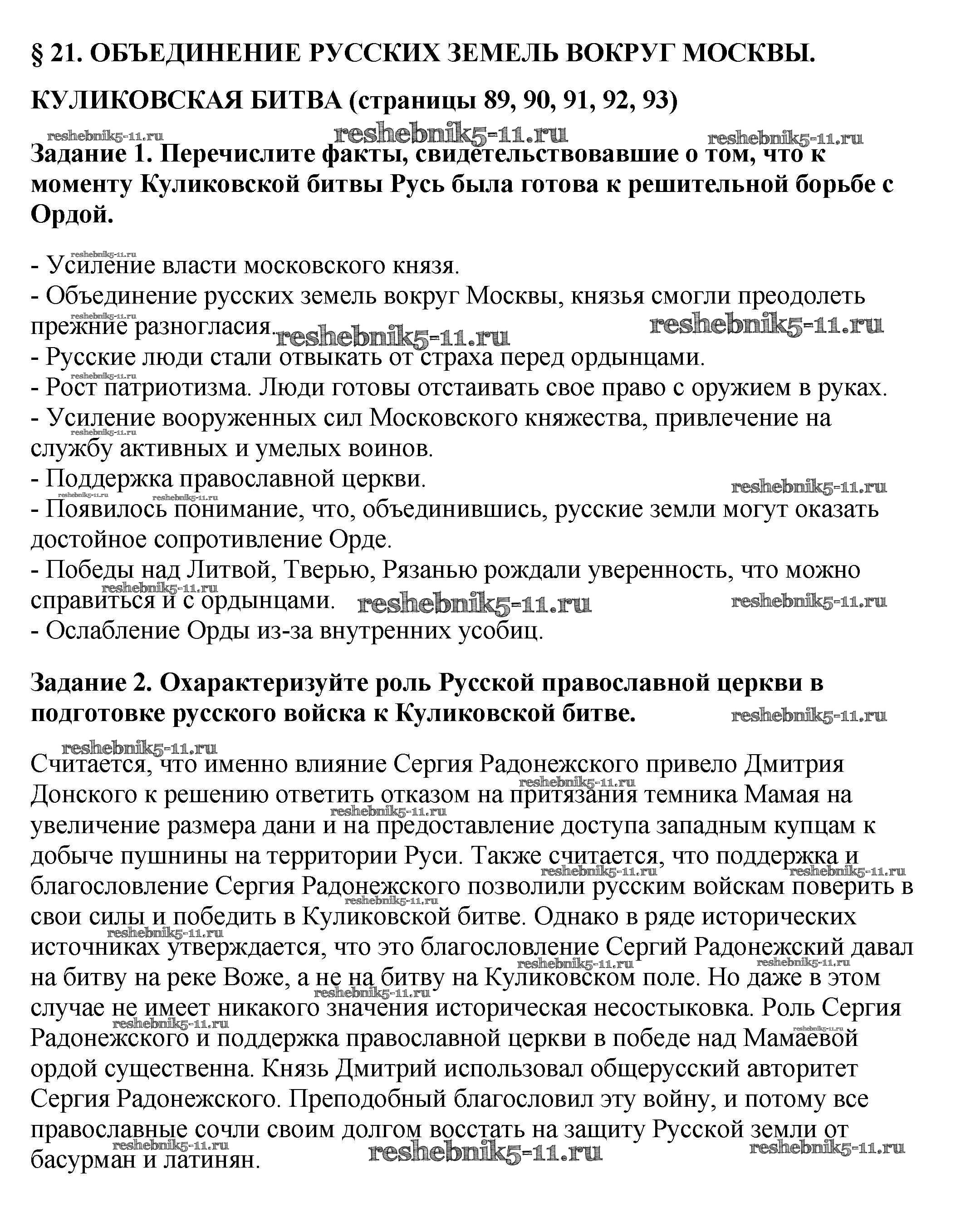 Готовая домашняя работа с ответами по Истории за 6 класс Артасов, Данилов, Косулина, Соколова Рабочая тетрадь Просвещение 2016 ФГОС - §21. Объединение русских земель вокруг Москвы. Куликовская битва стр. 89