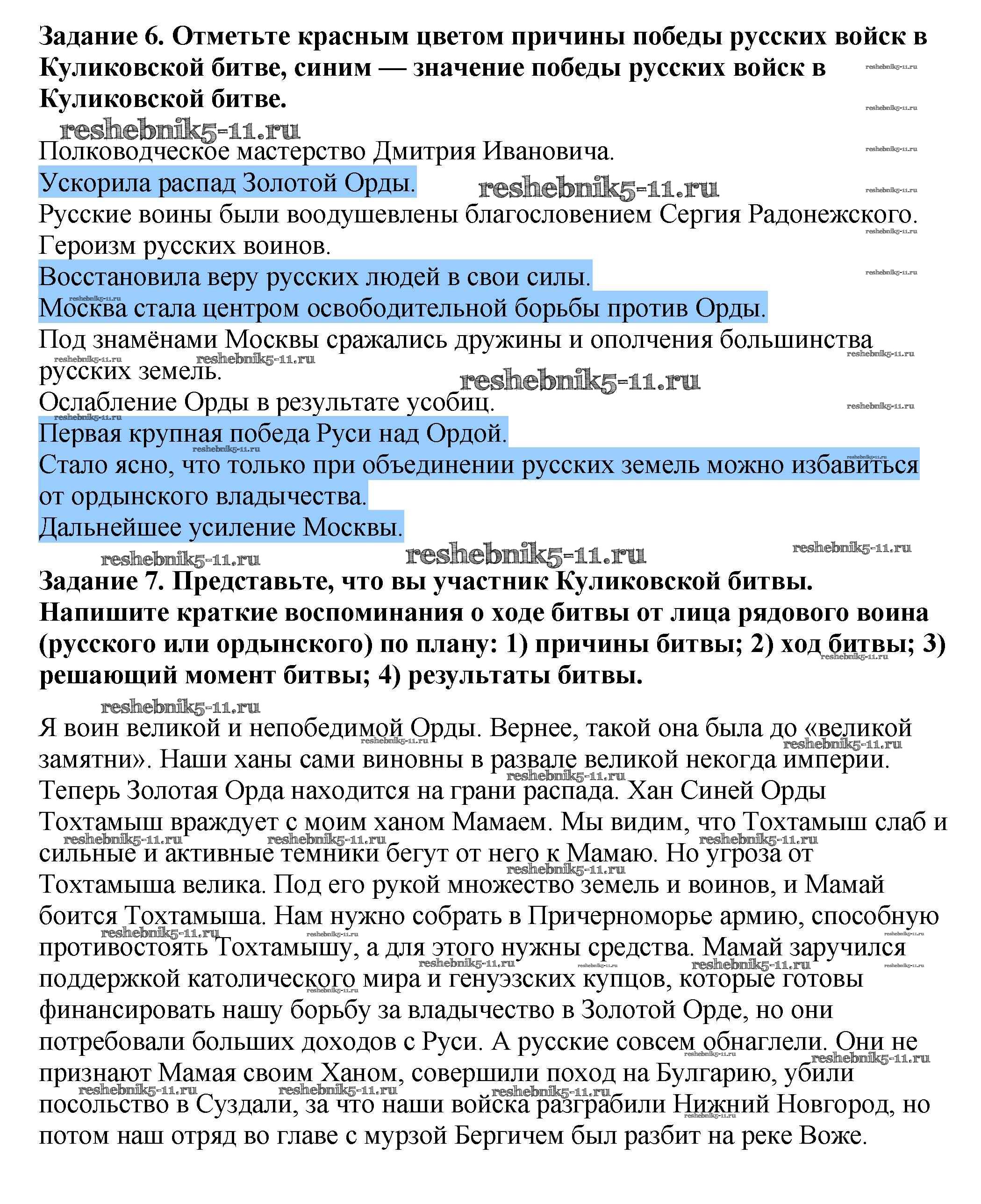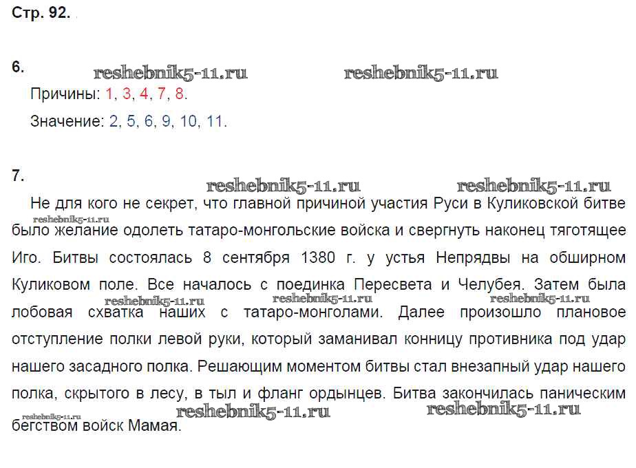Готовая домашняя работа с ответами по Истории за 6 класс Артасов, Данилов, Косулина, Соколова Рабочая тетрадь Просвещение 2016 ФГОС - §21. Объединение русских земель вокруг Москвы. Куликовская битва стр. 92