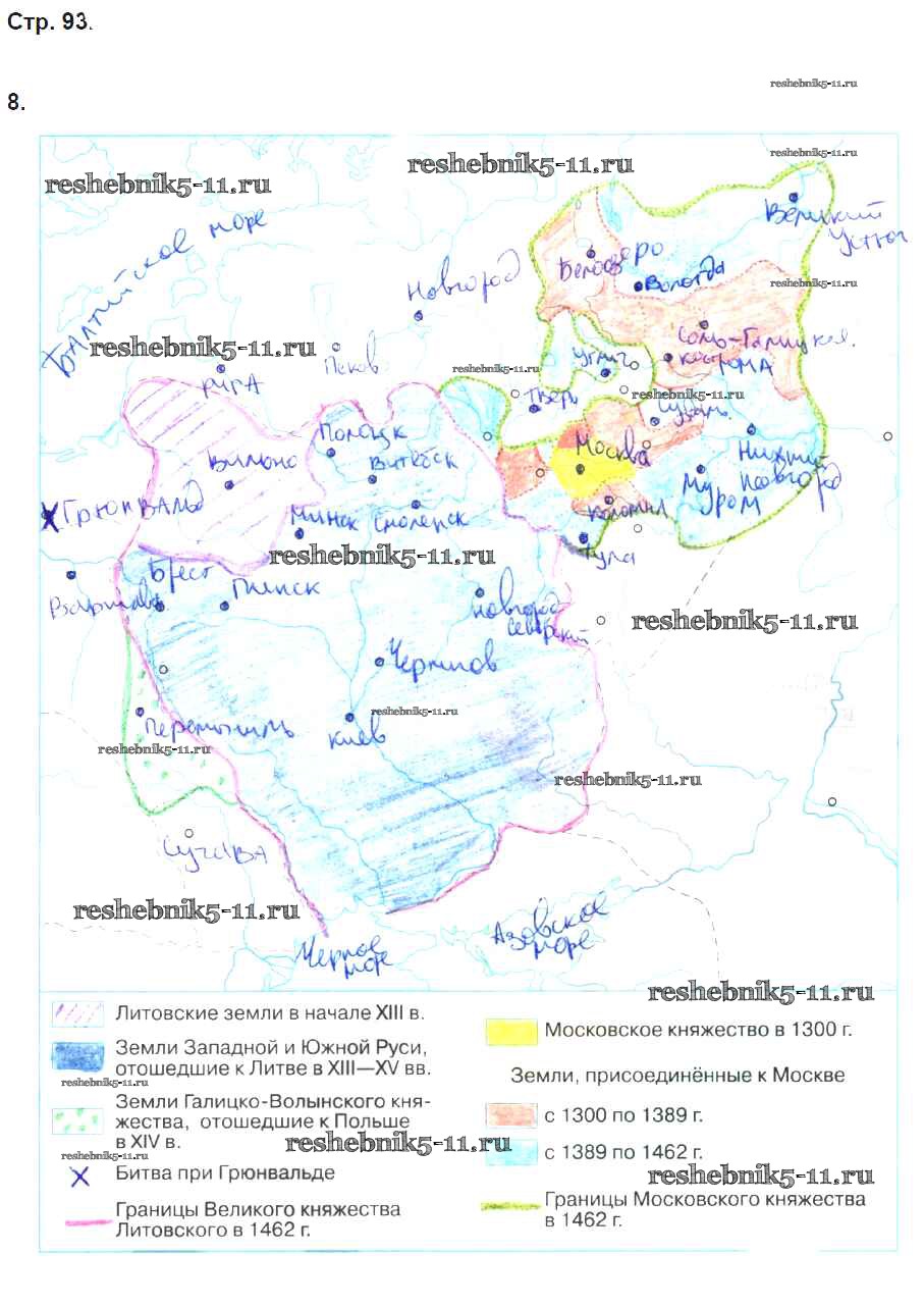 Готовая домашняя работа с ответами по Истории за 6 класс Артасов, Данилов, Косулина, Соколова Рабочая тетрадь Просвещение 2016 ФГОС - §21. Объединение русских земель вокруг Москвы. Куликовская битва стр. 93