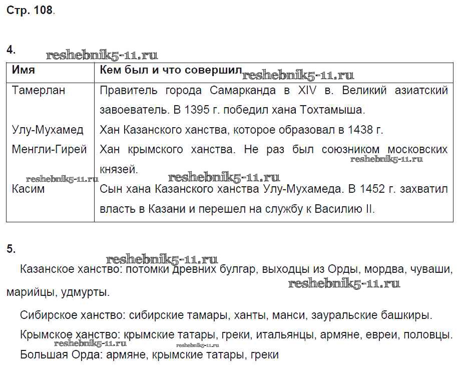 Готовая домашняя работа с ответами по Истории за 6 класс Артасов, Данилов, Косулина, Соколова Рабочая тетрадь Просвещение 2016 ФГОС - §25. Распад Золотой Орды и его последствия стр. 108