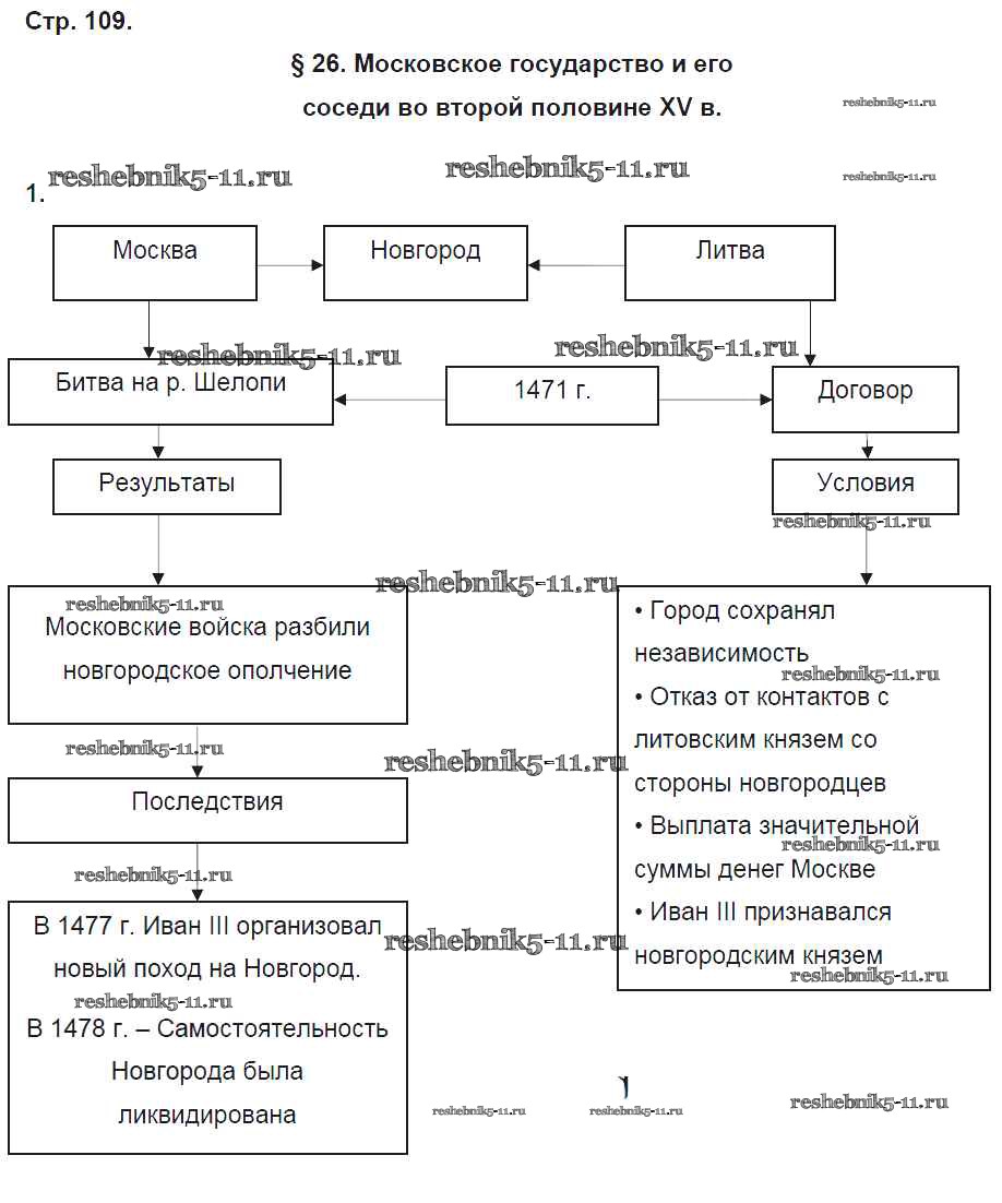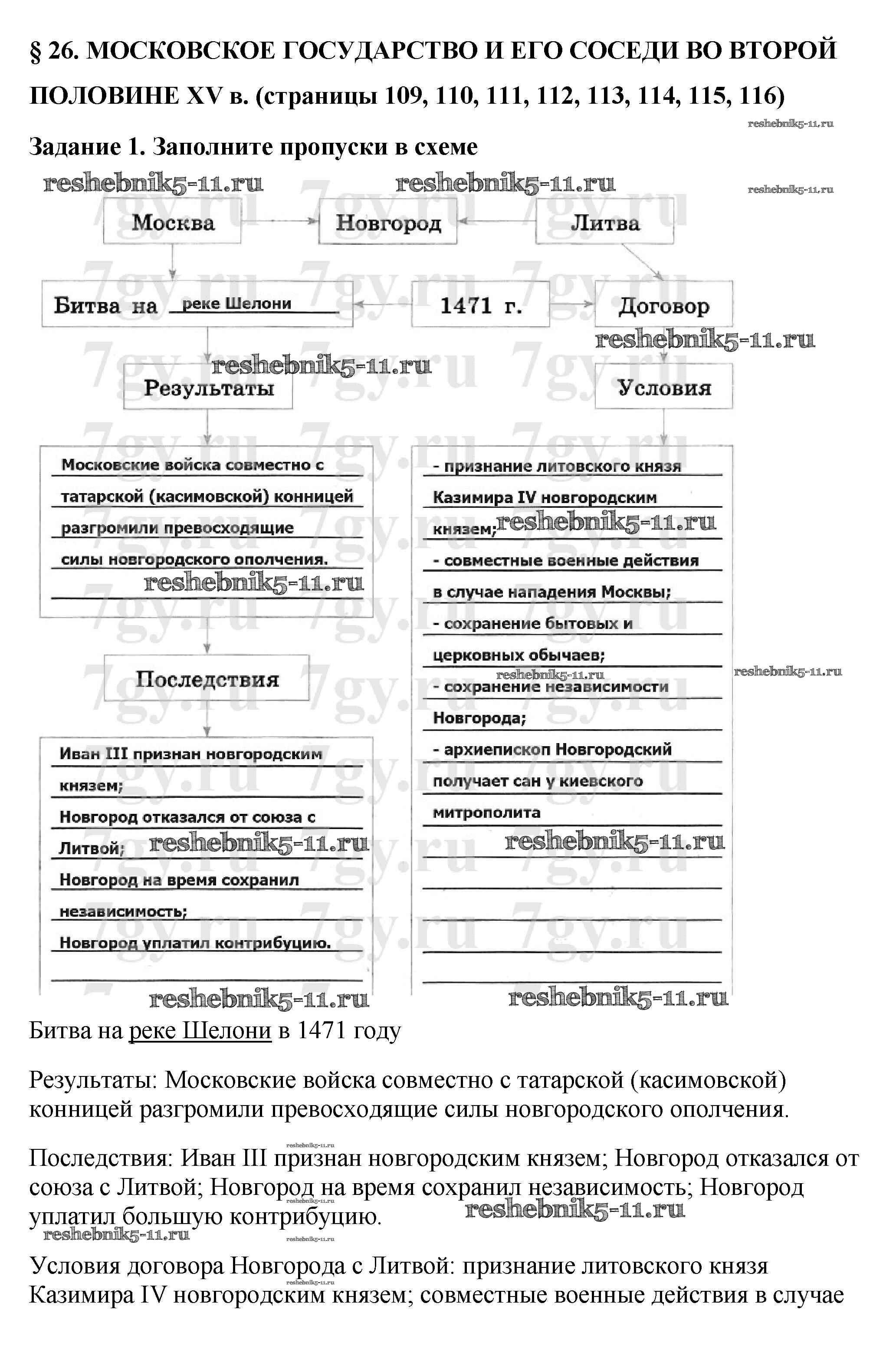 Готовая домашняя работа с ответами по Истории за 6 класс Артасов, Данилов, Косулина, Соколова Рабочая тетрадь Просвещение 2016 ФГОС - §26. Московское государство и его соседи во второй половине XV в. стр. 109