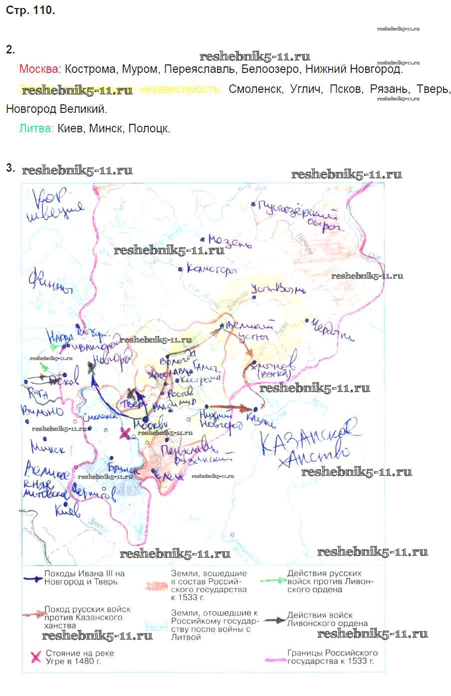 Готовая домашняя работа с ответами по Истории за 6 класс Артасов, Данилов, Косулина, Соколова Рабочая тетрадь Просвещение 2016 ФГОС - §26. Московское государство и его соседи во второй половине XV в. стр. 110