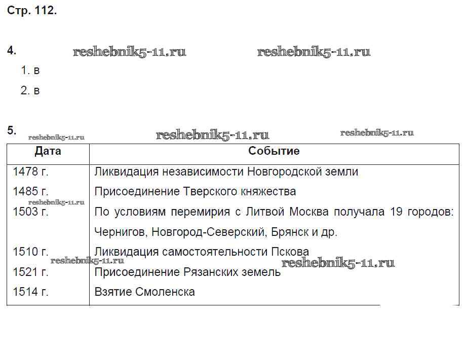 Готовая домашняя работа с ответами по Истории за 6 класс Артасов, Данилов, Косулина, Соколова Рабочая тетрадь Просвещение 2016 ФГОС - §26. Московское государство и его соседи во второй половине XV в. стр. 112