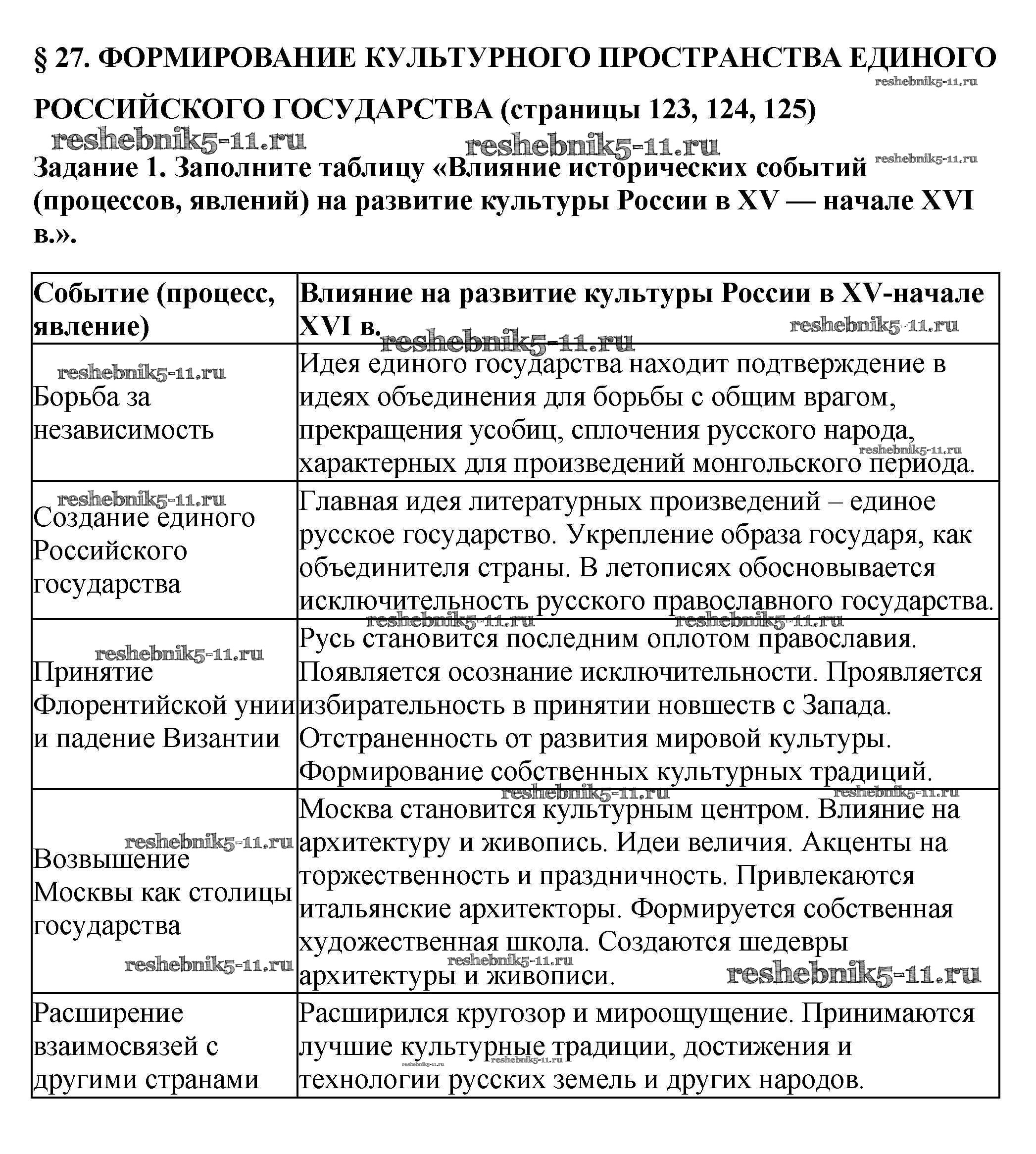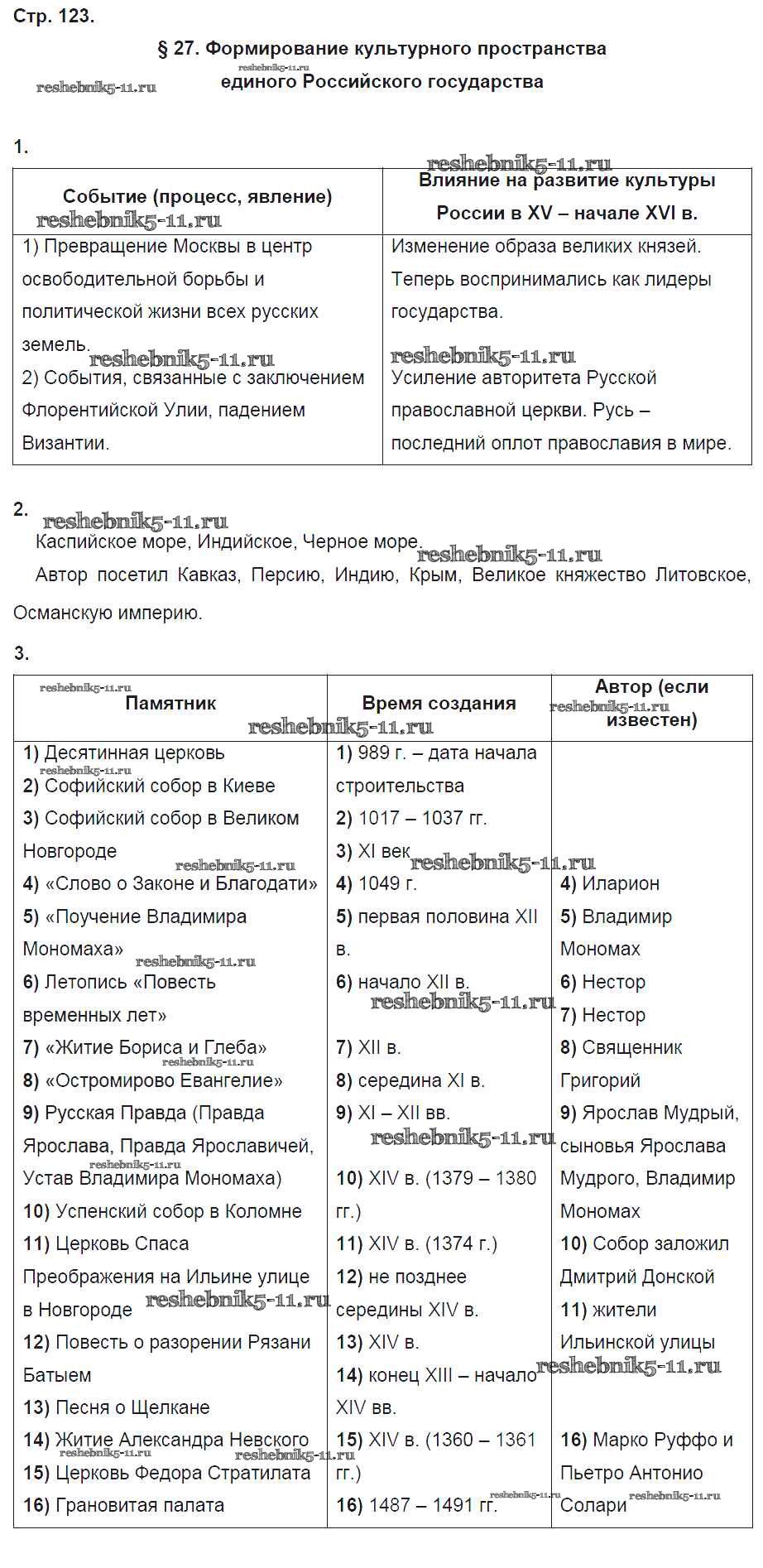 Готовая домашняя работа с ответами по Истории за 6 класс Артасов, Данилов, Косулина, Соколова Рабочая тетрадь Просвещение 2016 ФГОС - §27. Формирование культурного пространства единого Российского государства стр. 123