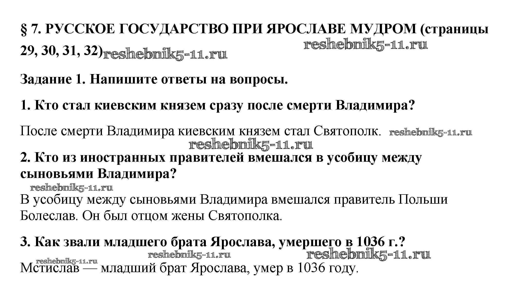 Готовая домашняя работа с ответами по Истории за 6 класс Артасов, Данилов, Косулина, Соколова Рабочая тетрадь Просвещение 2016 ФГОС - §7. Русское государство при Ярославе Мудром стр. 29
