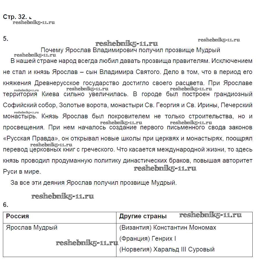 Готовая домашняя работа с ответами по Истории за 6 класс Артасов, Данилов, Косулина, Соколова Рабочая тетрадь Просвещение 2016 ФГОС - §7. Русское государство при Ярославе Мудром стр. 32