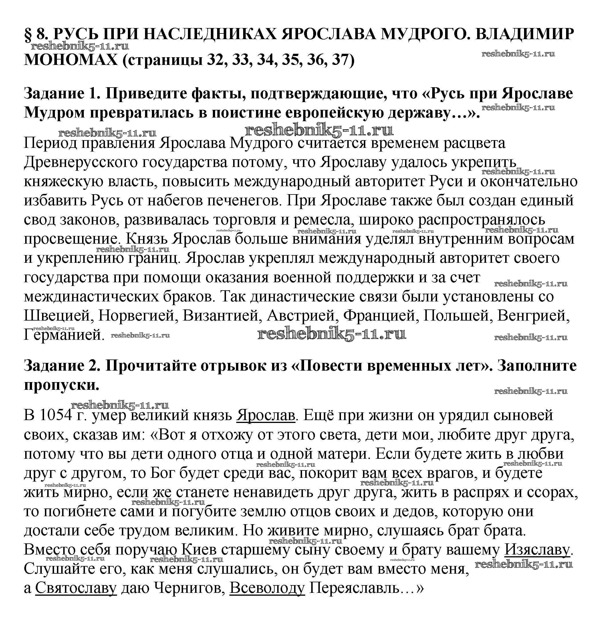 Готовая домашняя работа с ответами по Истории за 6 класс Артасов, Данилов, Косулина, Соколова Рабочая тетрадь Просвещение 2016 ФГОС - §8. Русь при наследниках Ярослава Мудрого. Владимир Мономах стр. 32
