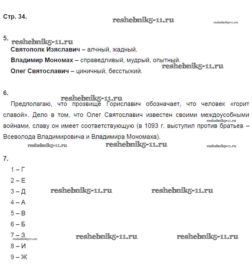 Готовая домашняя работа с ответами по Истории за 6 класс Артасов, Данилов, Косулина, Соколова Рабочая тетрадь Просвещение 2016 ФГОС - §8. Русь при наследниках Ярослава Мудрого. Владимир Мономах стр. 34