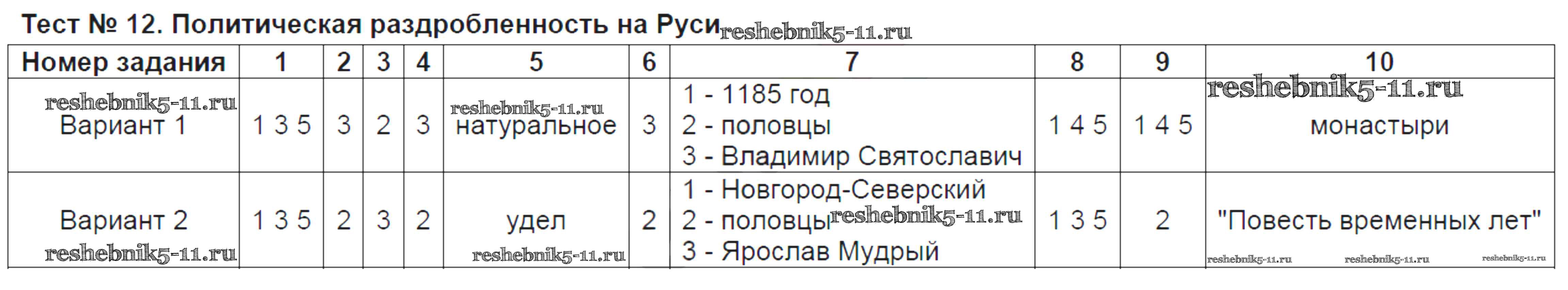 Готовая домашняя работа с ответами по Истории за 6 класс Воробьёва Тесты УМК Часть 1, 2 Экзамен 2017 ФГОС - Тесты Тест №12. Политическая раздробленность на Руси